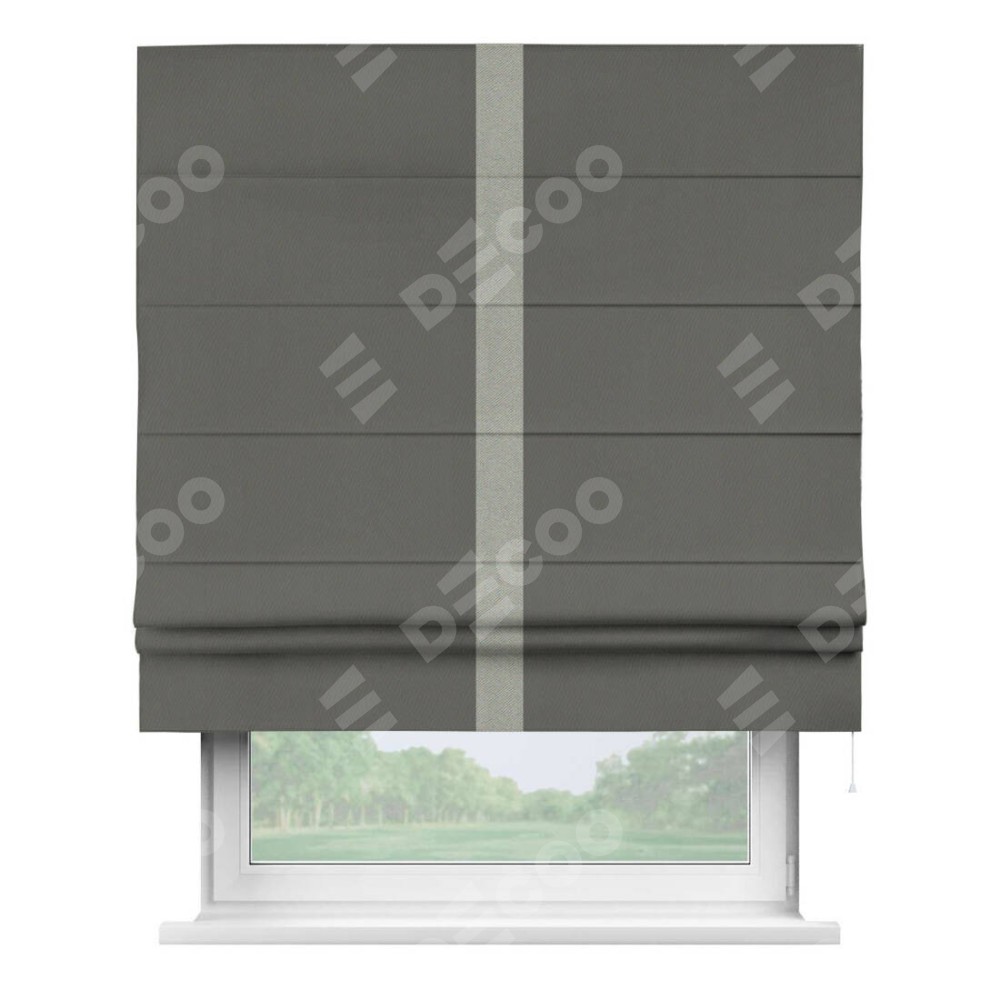 Римская штора производителя «Cortin», используется для проёма, пошита из ткани блэкаут однотонный тёмно-серый, артикул ткани 91570. Отделка шторы кантом «Хайвей», ткань для канта используется из блэкаута однотонного разной расцветки на выбор. Имеет универсальный механизм и подходит для монтажа: на потолок, на стену и в нишу.