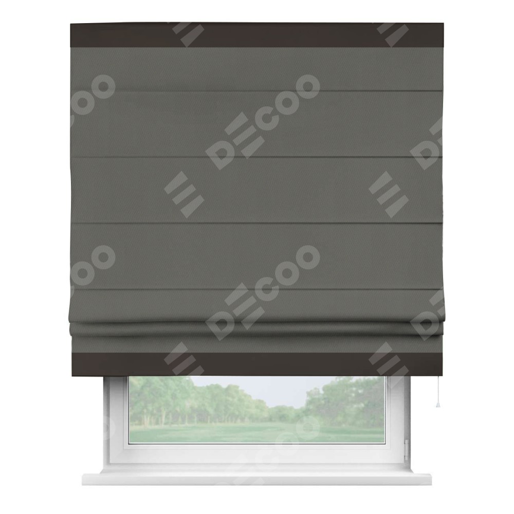 Римская штора производителя «Cortin», используется для проёма, пошита из ткани блэкаут однотонный тёмно-серый, артикул ткани 91570. Отделка шторы кантом «Горизонт», ткань для канта используется из блэкаута однотонного разной расцветки на выбор. Имеет универсальный механизм и подходит для монтажа: на потолок, на стену и в нишу.