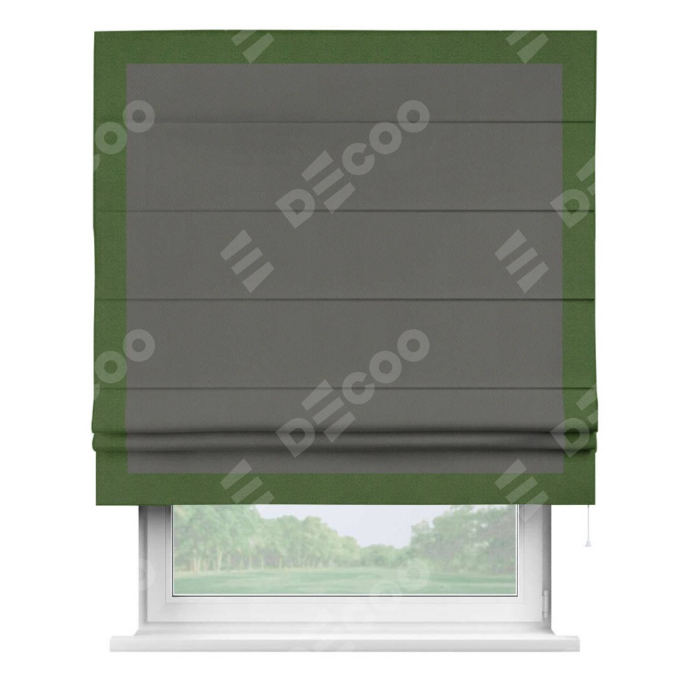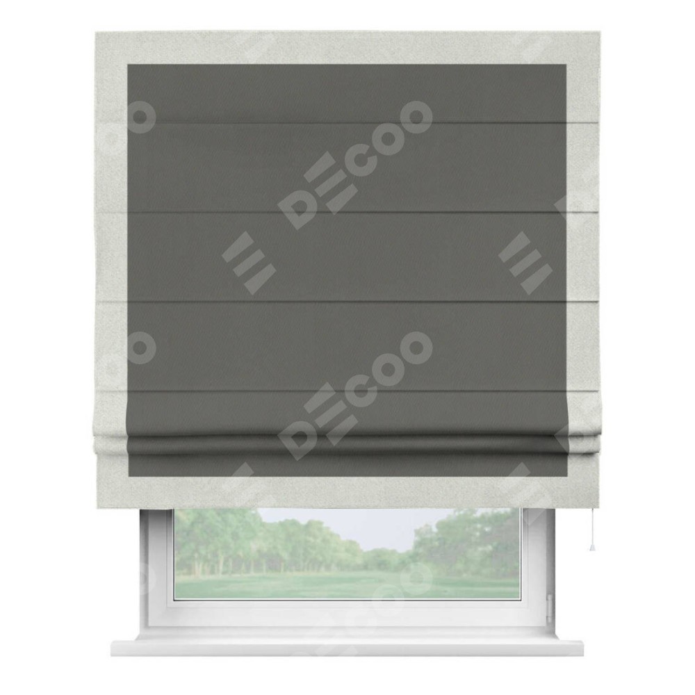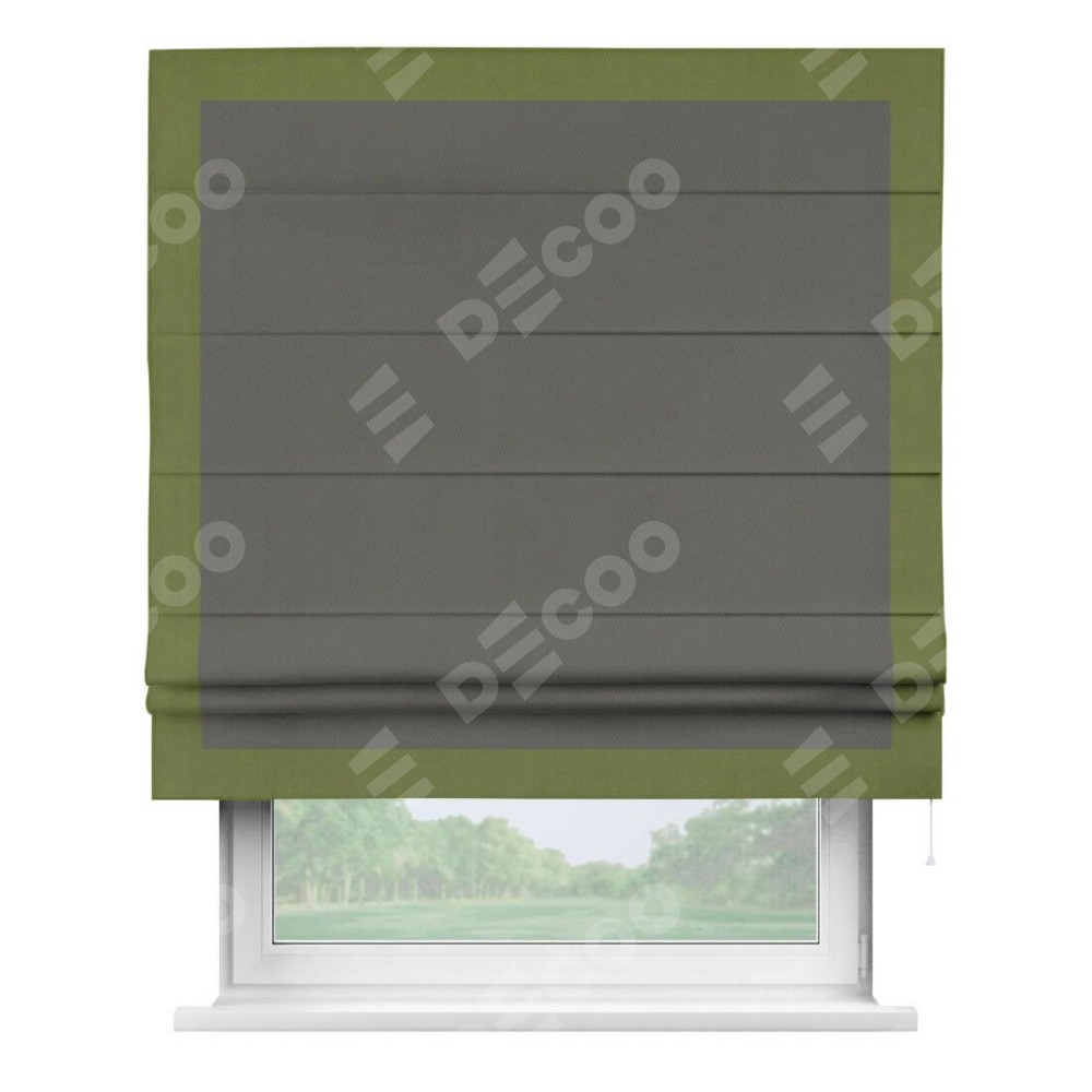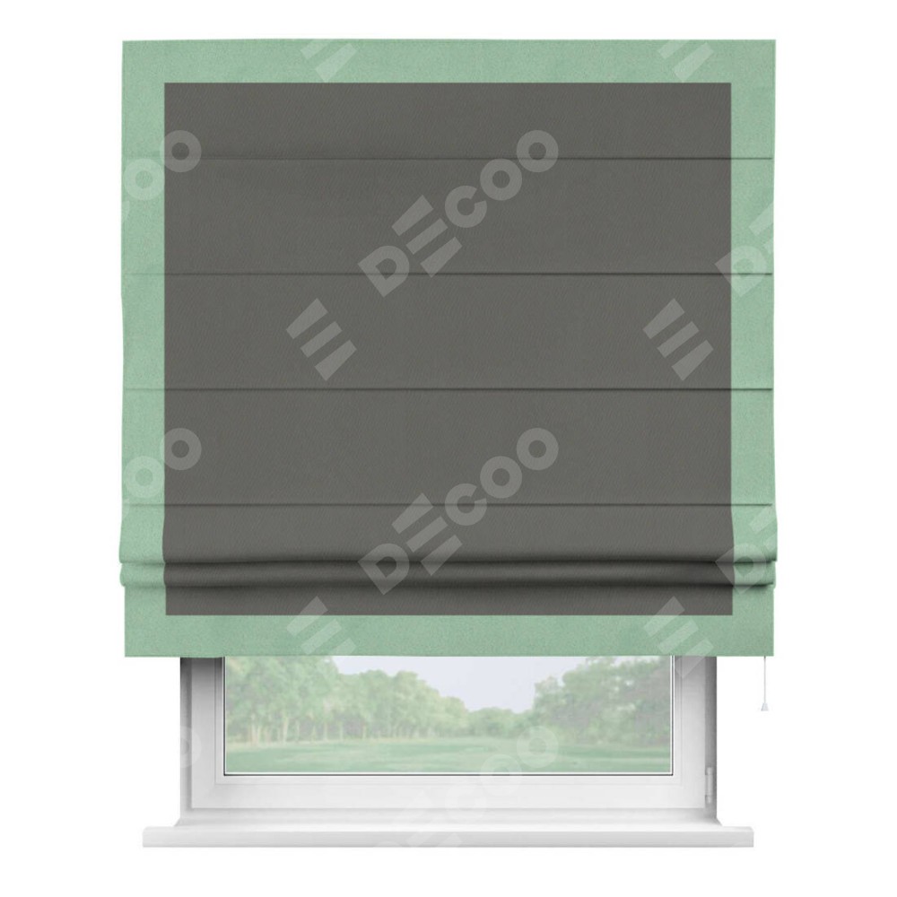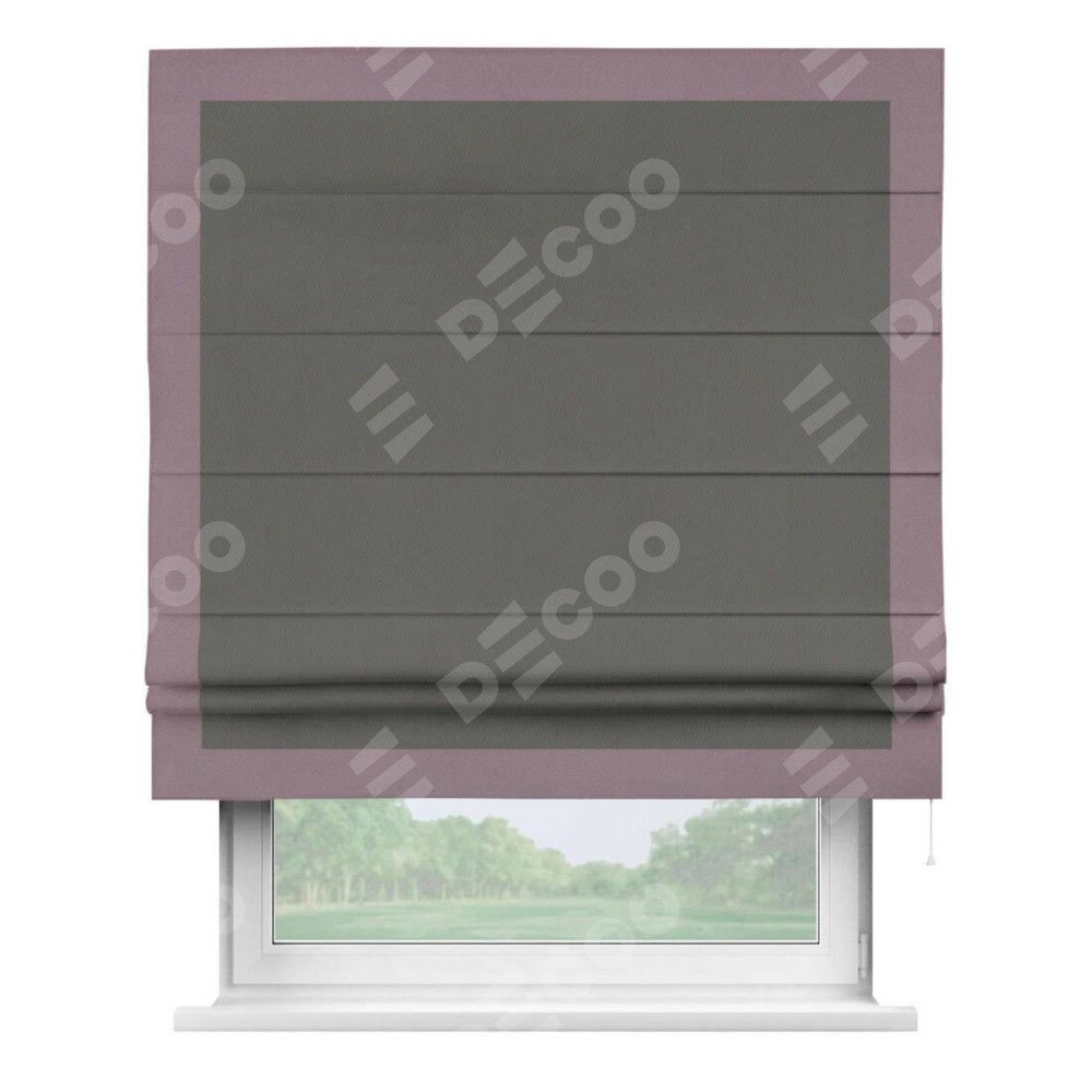 Римская штора производителя «Cortin», используется для проёма, пошита из ткани блэкаут однотонный тёмно-серый, артикул ткани 91570. Отделка шторы кантом «Чесс», ткань для канта используется из блэкаута однотонного разной расцветки на выбор. Имеет универсальный механизм и подходит для монтажа: на потолок, на стену и в нишу.