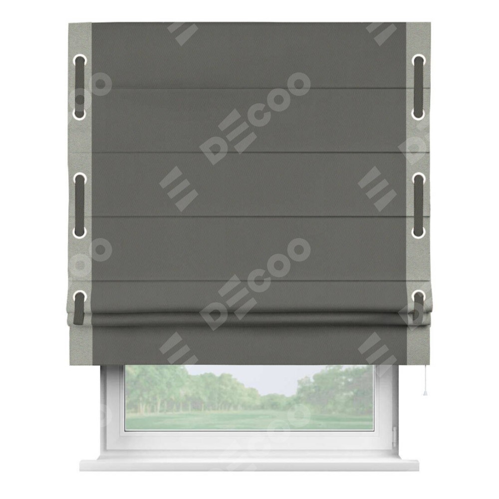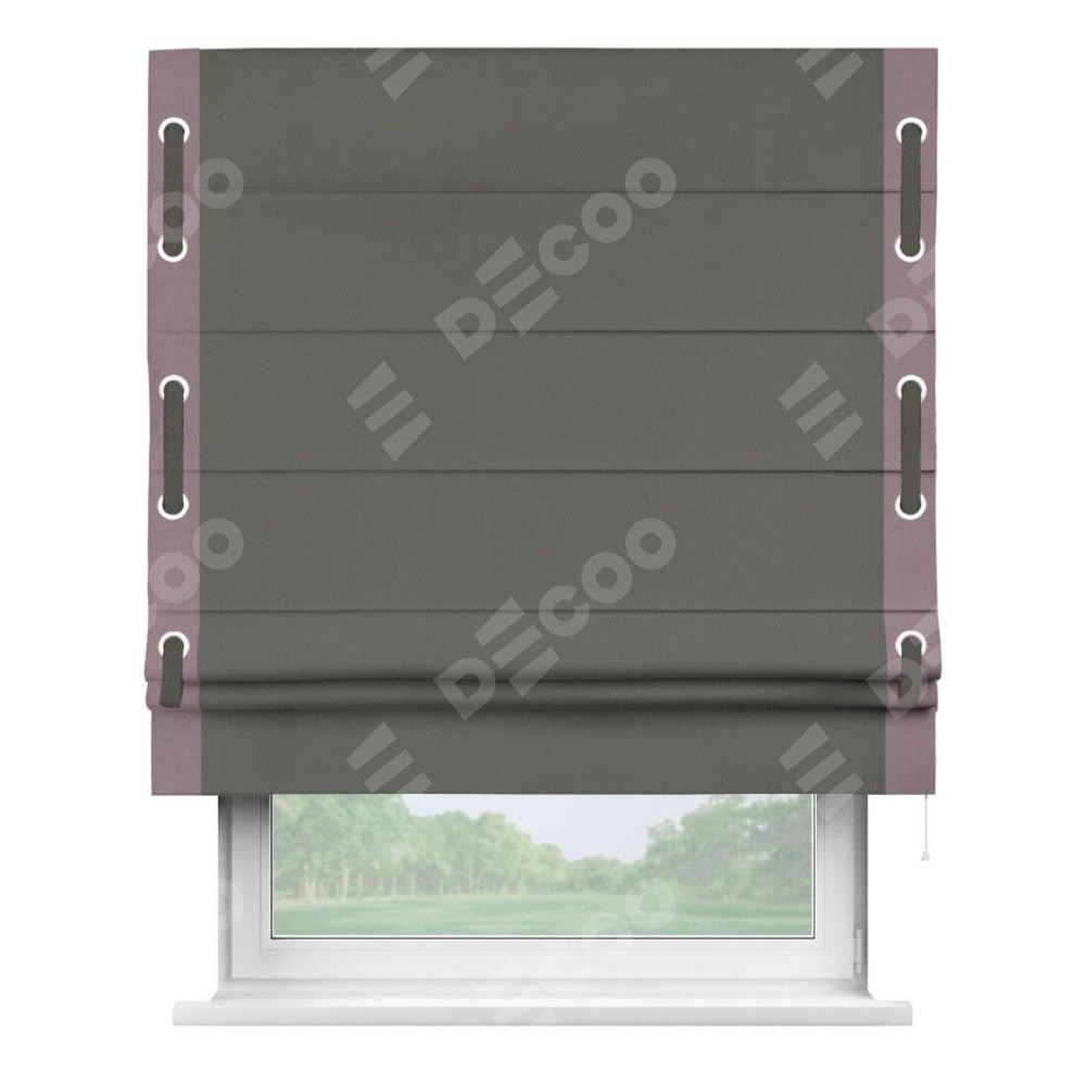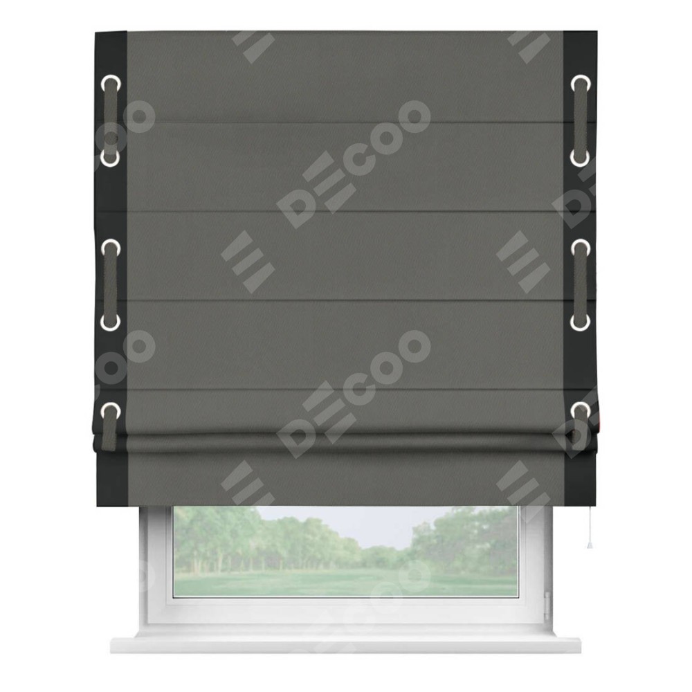 Римская штора производителя «Cortin», используется для проёма, пошита из ткани блэкаут однотонный тёмно-серый, артикул ткани 91570. Отделка шторы кантом «Стрим Дуо» на кантах расположены люверсы с пояском, ткань для канта используется из блэкаута однотонного разной расцветки на выбор. Ткань для пояска обычно используется из основной ткани шторы, а так же можно сделать из любой расцветки по желанию. Имеет универсальный механизм и подходит для монтажа: на потолок, на стену и в нишу.