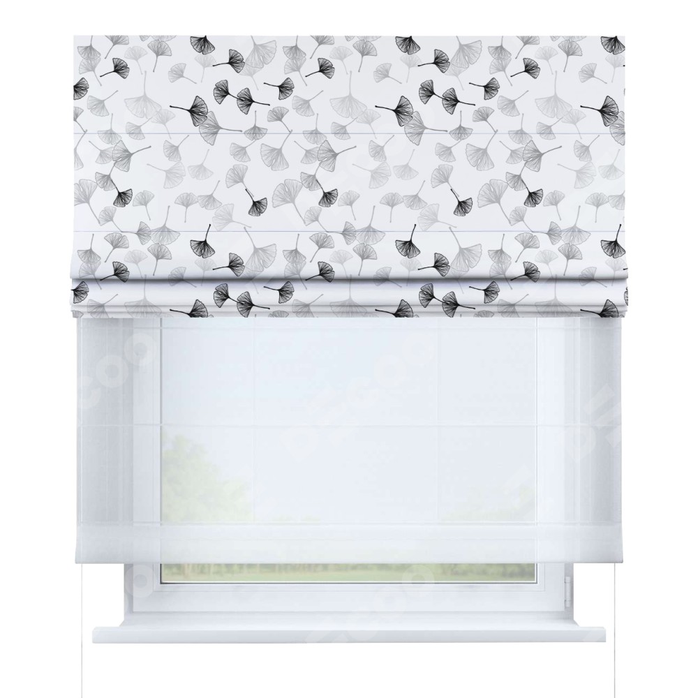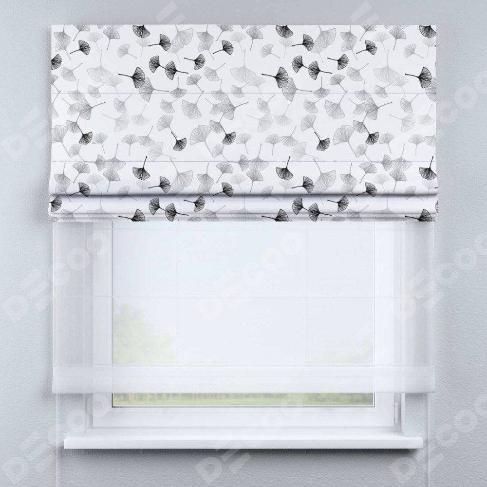 Двойная римская штора «День-ночь» от производителя Cortin предназначена для использования в проёмах. Эта штора уникальна тем, что состоит из двух полотен. На лицевой стороне находится блэкаут с нанесением сублимационной печати «Дымчатые листочки», обеспечивающий эффективное затемнение. В комплект также входит вторая ткань — легкий белый тюль (артикул: V-01), который добавляет изящества и легкости оформлению окна. Кроме того, доступны и другие разновидности ткани тюль, выбор которых доступен по ссылке .