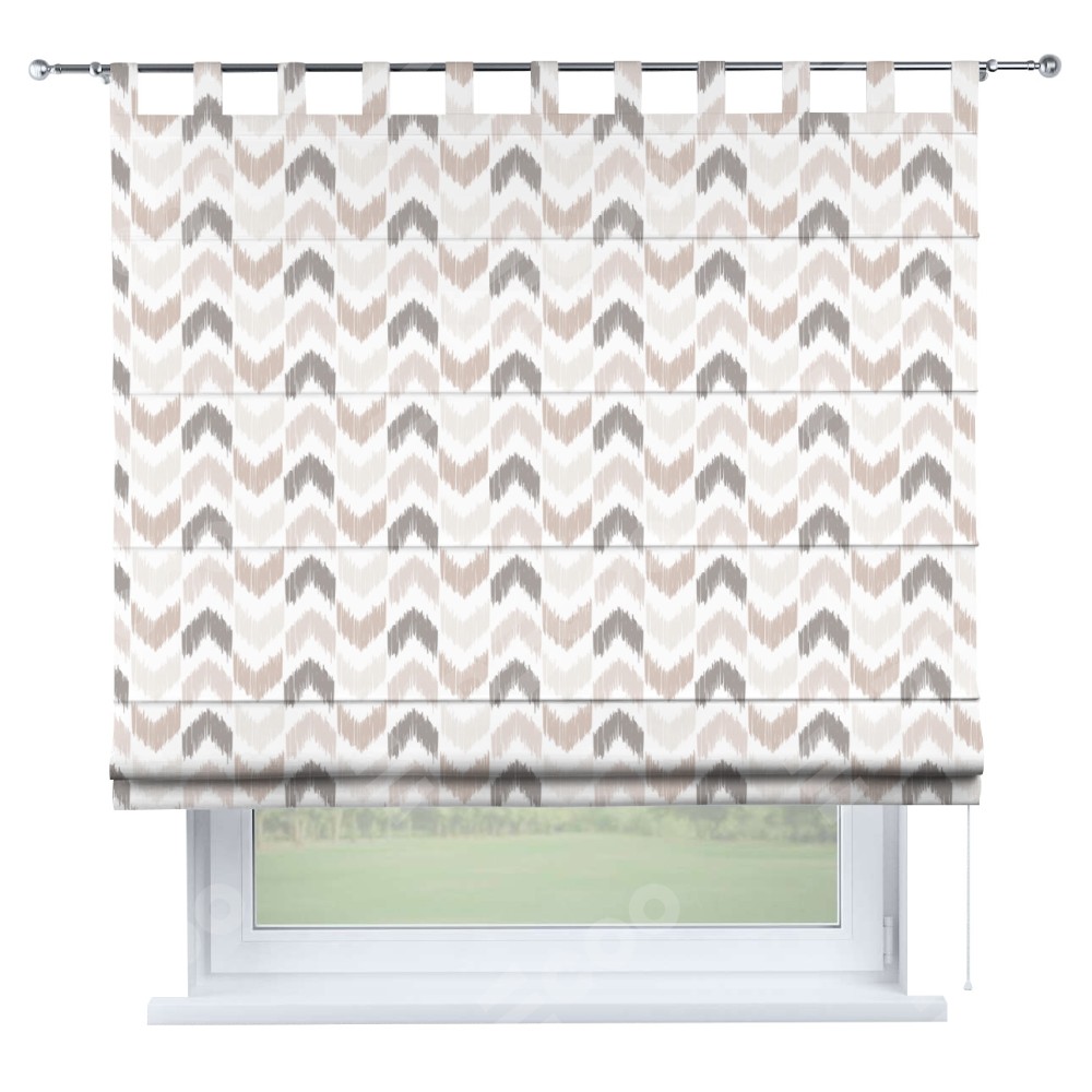 Римская штора производителя «Cortin», используется для проёма, пошита из ткани блэкаут с нанесением сублимационной печати «Икат стрелки». Данная модель пошита на петлях, комплектуется на выбор круглым карнизом и подходит для монтажа на стену. Римская штора на петлях имеет простую систему регулировки высоты, отличительным преимуществом данной модели является простой способ монтажа. Достаточно повесить ее на трубу и штора готова!