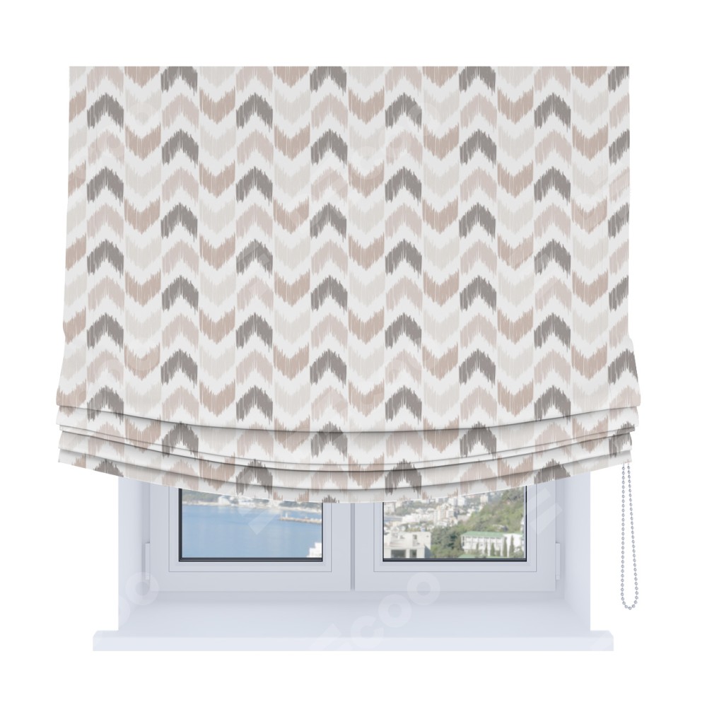 Римская штора Soft производителя «Cortin», используется для проёма, пошита из ткани блэкаут с нанесением сублимационной печати «Икат стрелки». Имеет универсальный механизм и подходит для монтажа: на потолок, на стену и в нишу. В отличие от стандартных римских штор, римская штора Soft не имеет горизонтальных вставок и нижнего отвеса. Это позволяет ткани произвольно драпироваться в свободные мягкие складки.