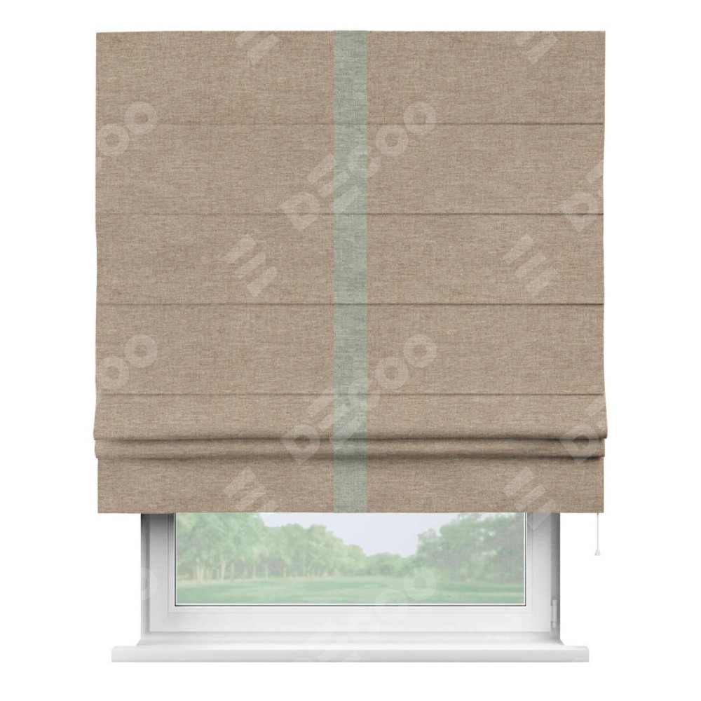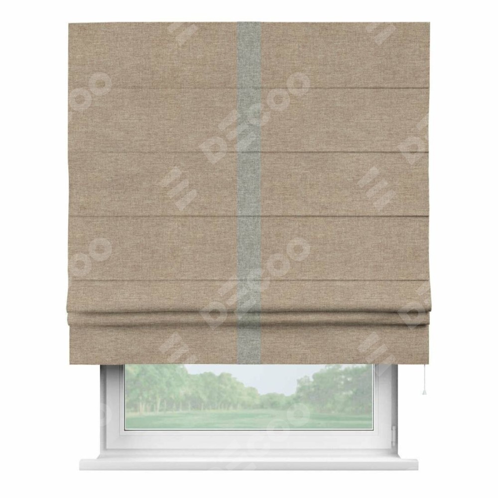 Римская штора производителя «Cortin», используется для проёма, пошита из ткани лён кашемир коричневый, артикул 21614. Отделка шторы кантом «Хайвэй», ткань для канта используется из льна разной расцветки на выбор. Имеет универсальный механизм и подходит для монтажа: на потолок, на стену и в нишу.