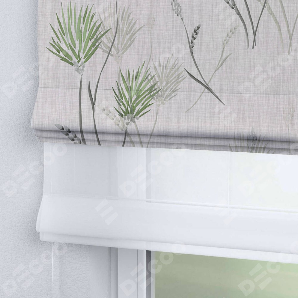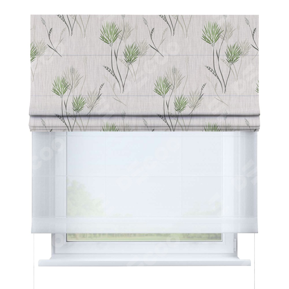 Двойная римская штора «День-ночь» от производителя Cortin предназначена для использования в проёмах. Эта штора уникальна тем, что состоит из двух полотен. На лицевой стороне находится блэкаут с нанесением сублимационной печати «Полевые травы бежевый», обеспечивающий эффективное затемнение. В комплект также входит вторая ткань — легкий белый тюль (артикул: V-01), который добавляет изящества и легкости оформлению окна. Кроме того, доступны и другие разновидности ткани тюль, выбор которых доступен по ссылке .