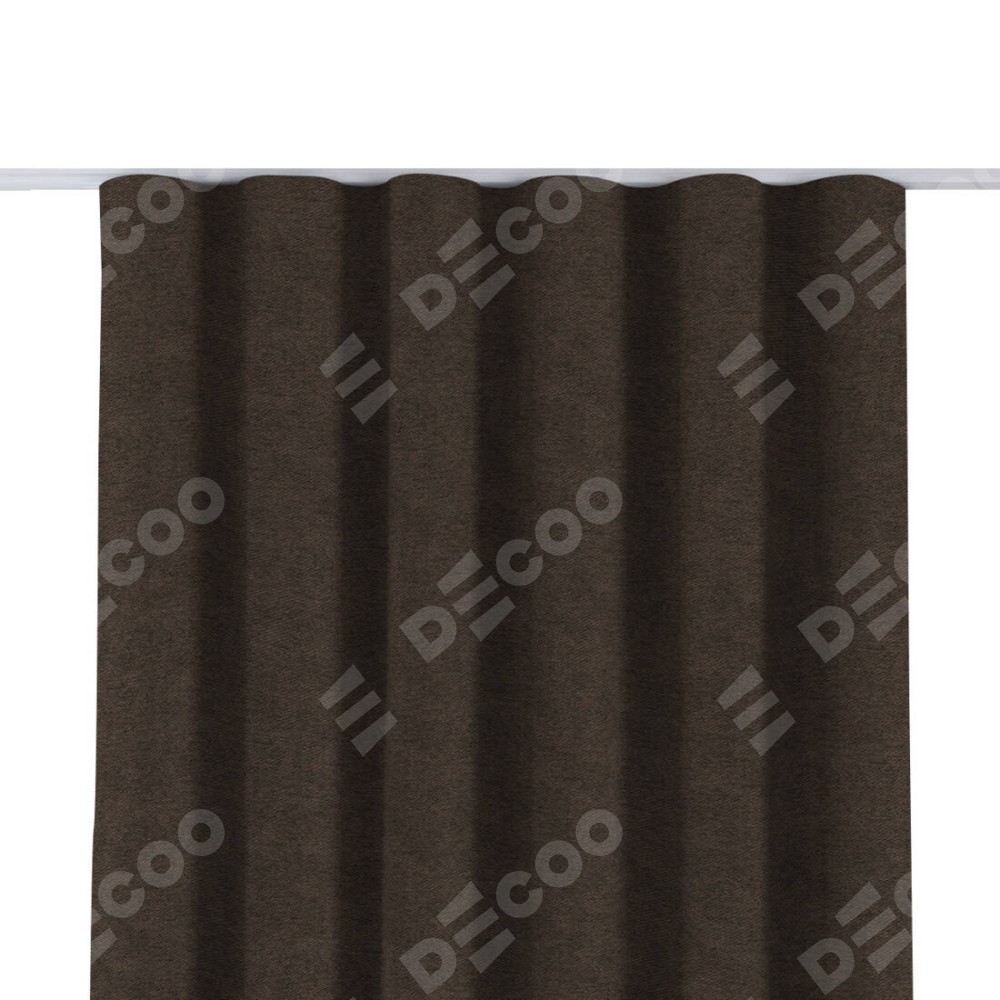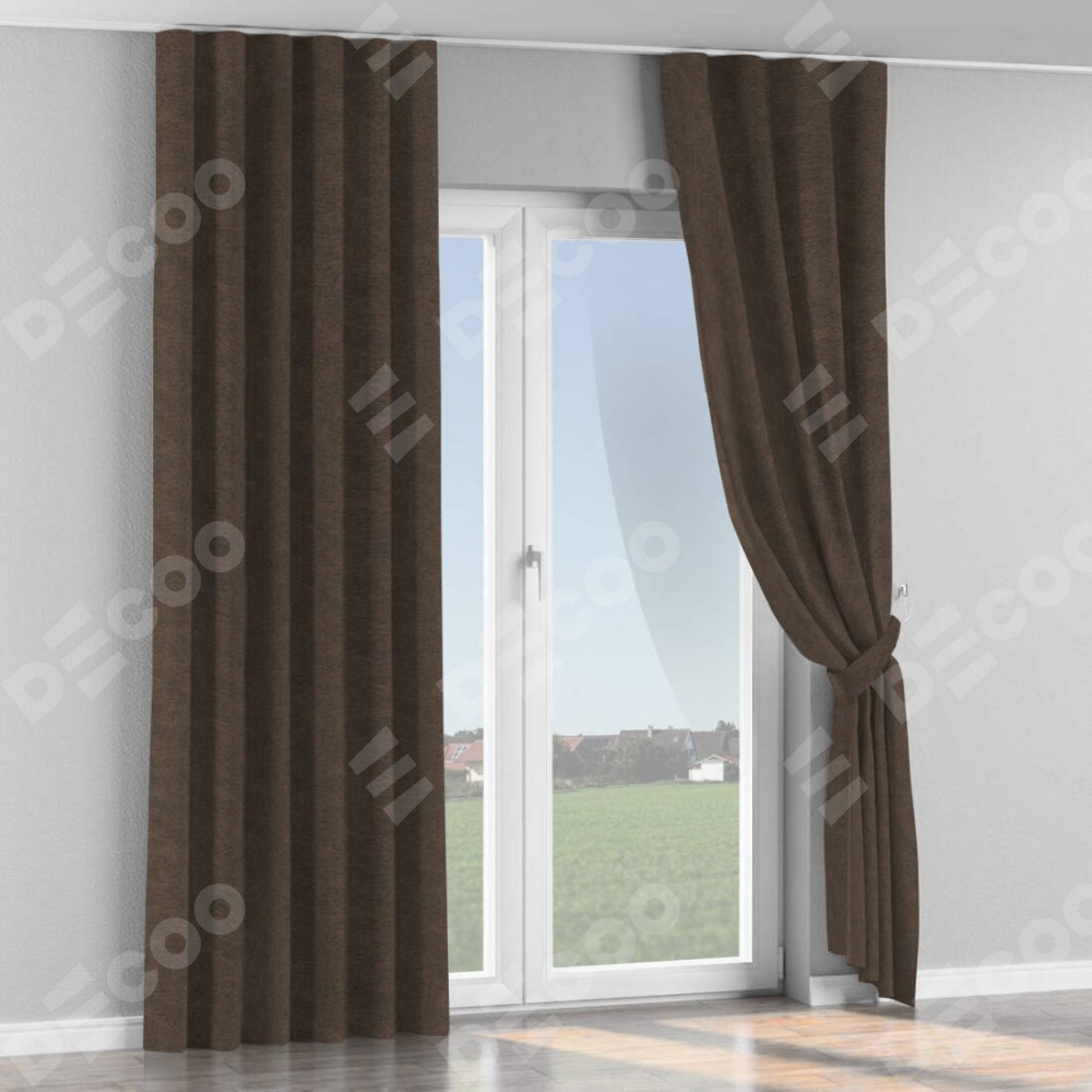 Комплект прямых штор, от производителя «Cortin», пошиты из ткани твид блэкаут тёмно-коричневый, артикул ткани 90933. С изнаночной стороны в верхней части штор пристрачивается шторная лента с декоративными складками «Волна». Для создания элегантных складок прямые шторы шьются по стандарту с коэффициентом 1:2 (на 100 см. ширины проёма 200 см. ширины ткани).