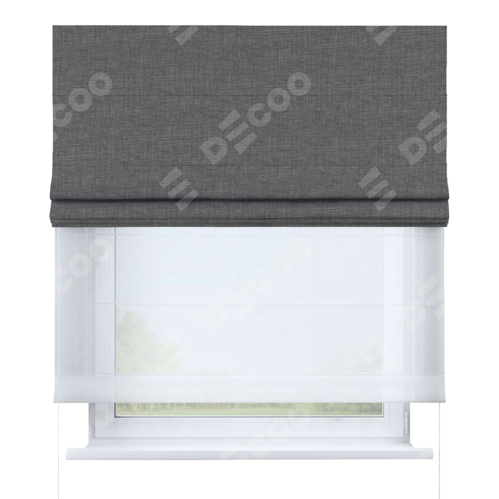 Двойная римская штора «День-ночь» от производителя Cortin предназначена для использования в проёмах. Эта штора уникальна тем, что состоит из двух полотен. На лицевой стороне находится лён тёмно-серый (артикул: 7441), обеспечивающий мягкое затемнение. В комплект также входит вторая ткань — легкий белый тюль (артикул: V-01), который добавляет изящества и легкости оформлению окна. Кроме того, доступны и другие разновидности ткани тюль, выбор которых доступен по ссылке .