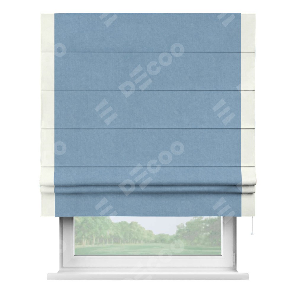 Римская штора производителя «Cortin», используется для проёма, пошита из ткани канвас голубой, артикул ткани 92729. Отделка шторы кантом «Стрим Дуо» (молочный v-93), ткань для канта используется из канваса разной расцветки на выбор. Имеет универсальный механизм и подходит для монтажа: на потолок, на стену и в нишу.