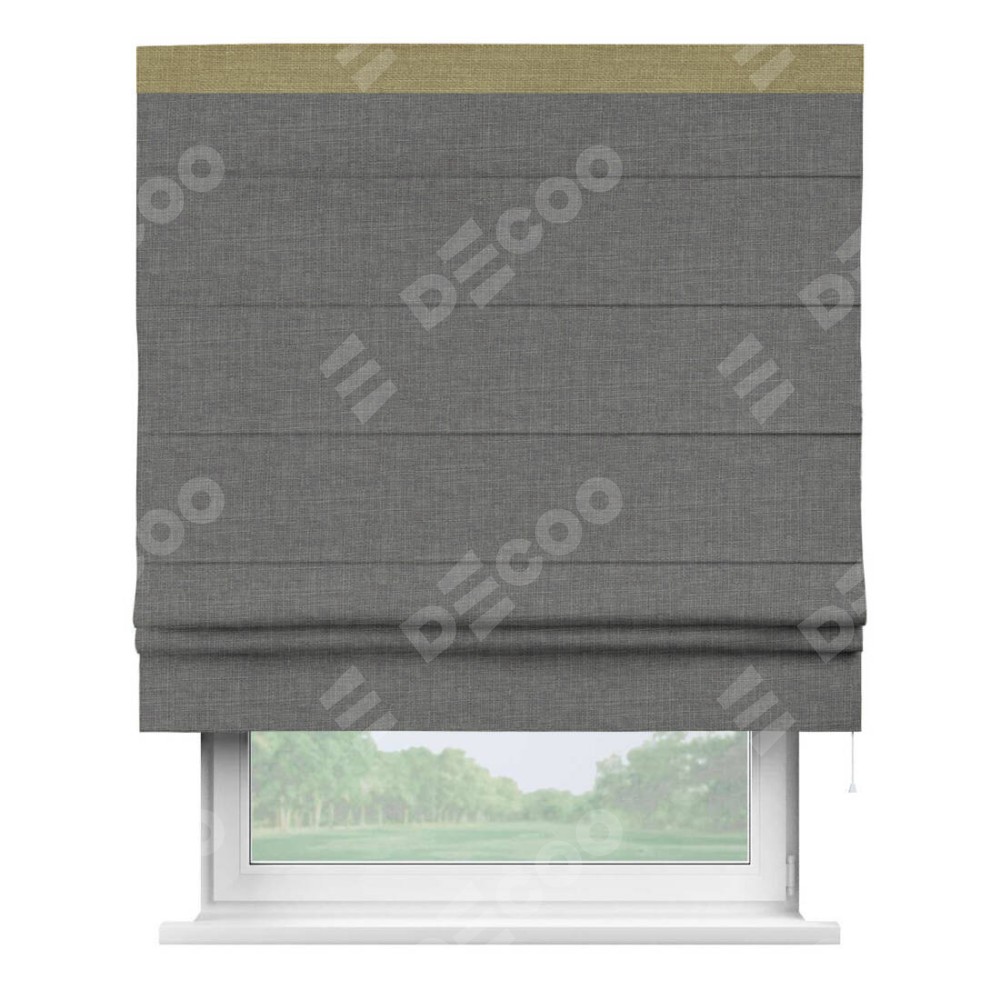 Римская штора производителя «Cortin», используется для проёма, пошита из ткани лён тёмно-серый, артикул 7441. Отделка шторы кантом «Кинг», ткань для канта используется из льна разной расцветки на выбор. Имеет универсальный механизм и подходит для монтажа: на потолок, на стену и в нишу.