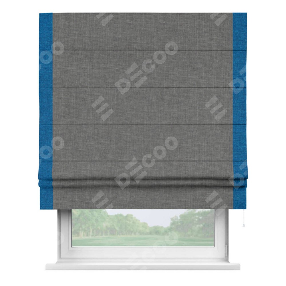 Римская штора производителя «Cortin», используется для проёма, пошита из ткани лён тёмно-серый, артикул 7441. Отделка шторы кантом «Стрим Дуо», ткань для канта используется из льна разной расцветки на выбор. Имеет универсальный механизм и подходит для монтажа: на потолок, на стену и в нишу.