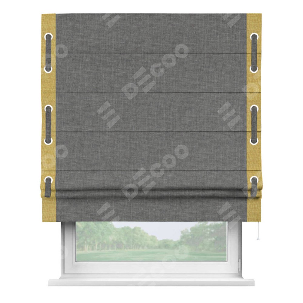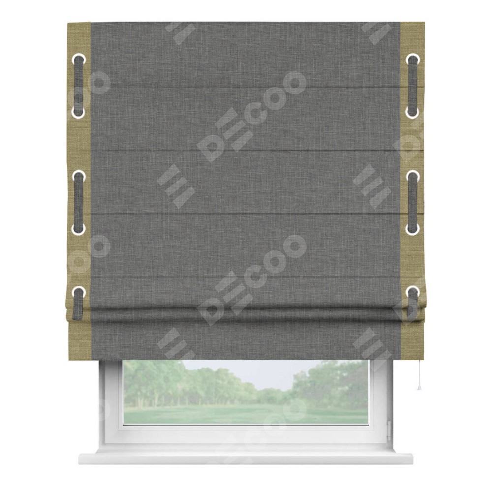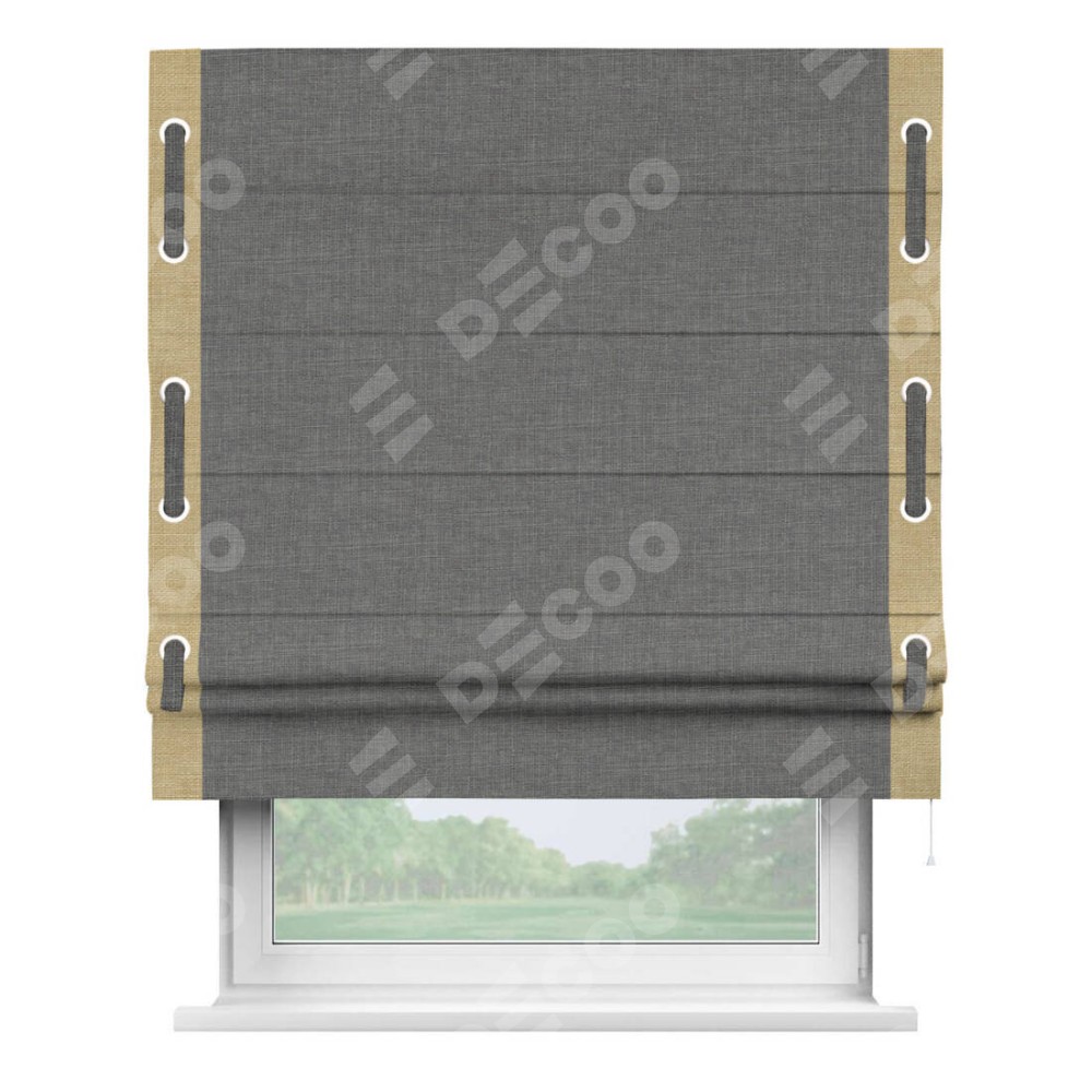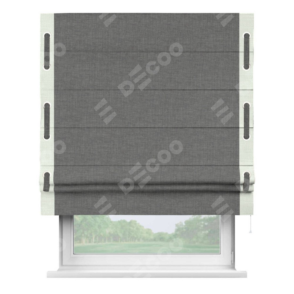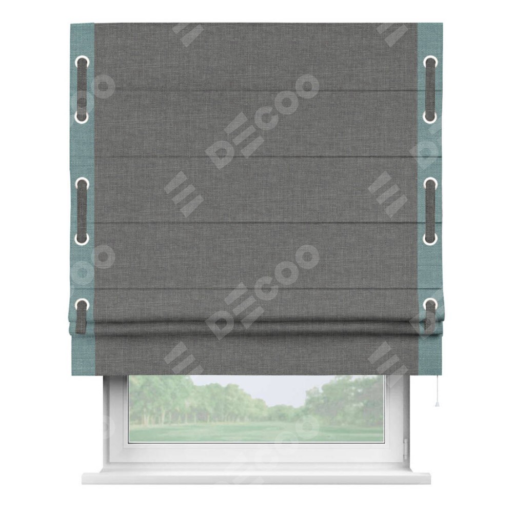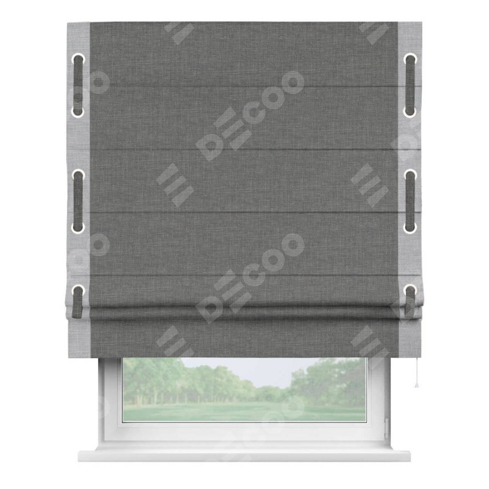 Римская штора производителя «Cortin», используется для проёма, пошита из ткани лён тёмно-серый, артикул 7441. Отделка шторы кантом «Стрим Дуо» на кантах расположены люверсы с пояском, ткань для канта используется из льна разной расцветки на выбор. Ткань для пояска обычно используется из основной ткани шторы, а так же можно сделать из любой расцветки по желанию. Имеет универсальный механизм и подходит для монтажа: на потолок, на стену и в нишу.
