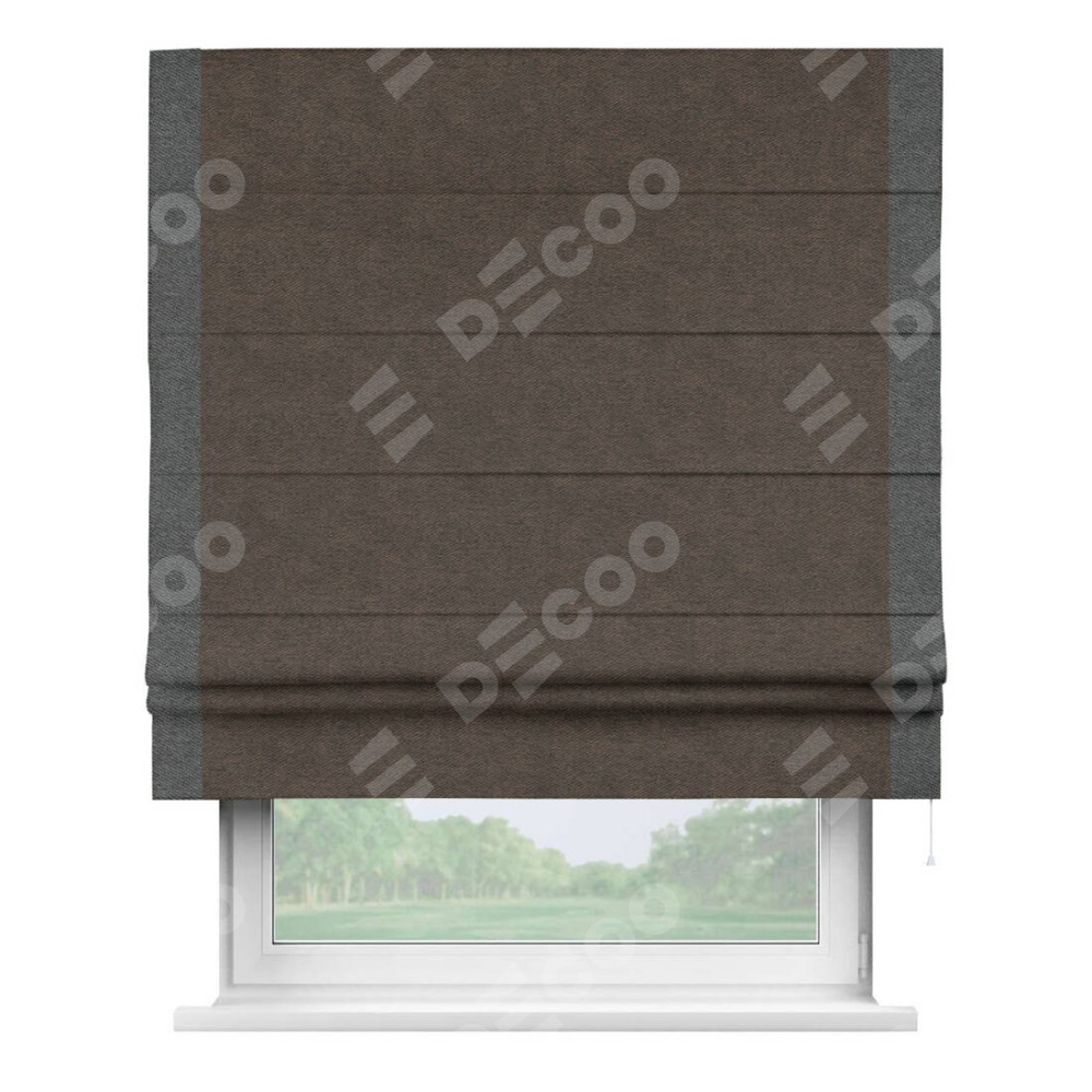 Римская штора производителя «Cortin», используется для проёма, пошита из ткани твид блэкаут тёмно-коричневый, артикул 90933. Отделка шторы кантом «Стрим Дуо», ткань для канта используется из твида разной расцветки на выбор. Имеет универсальный механизм и подходит для монтажа: на потолок, на стену и в нишу.