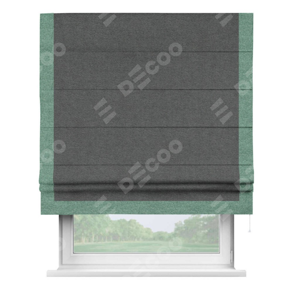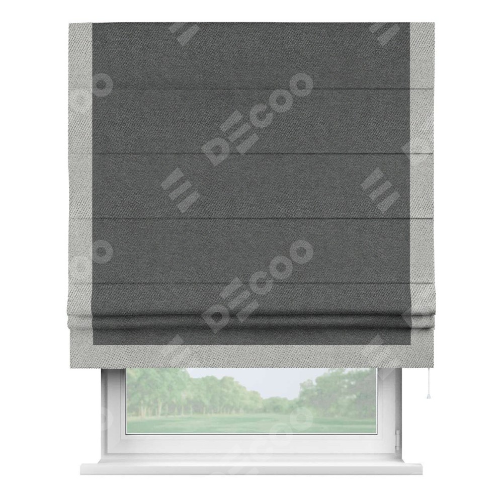 Римская штора производителя «Cortin», используется для проёма, пошита из ткани твид блэкаут тёмно-серый, артикул 90938. Отделка шторы кантом «Виктория», ткань для канта используется из твида разной расцветки на выбор. Имеет универсальный механизм и подходит для монтажа: на потолок, на стену и в нишу.