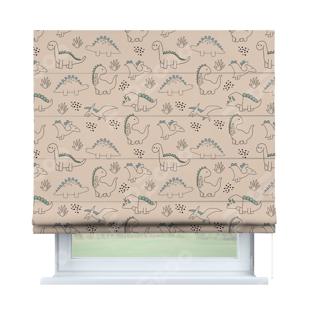 Классическая римская штора производителя «Cortin», пошита из ткани блэкаут с нанесением сублимационной печати «Динозаврики». Имеет универсальный механизм и подходит для монтажа: на потолок, на стену и в нишу.