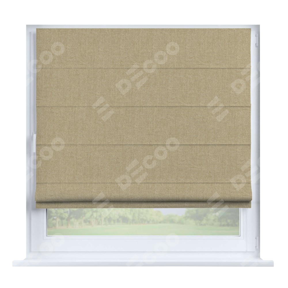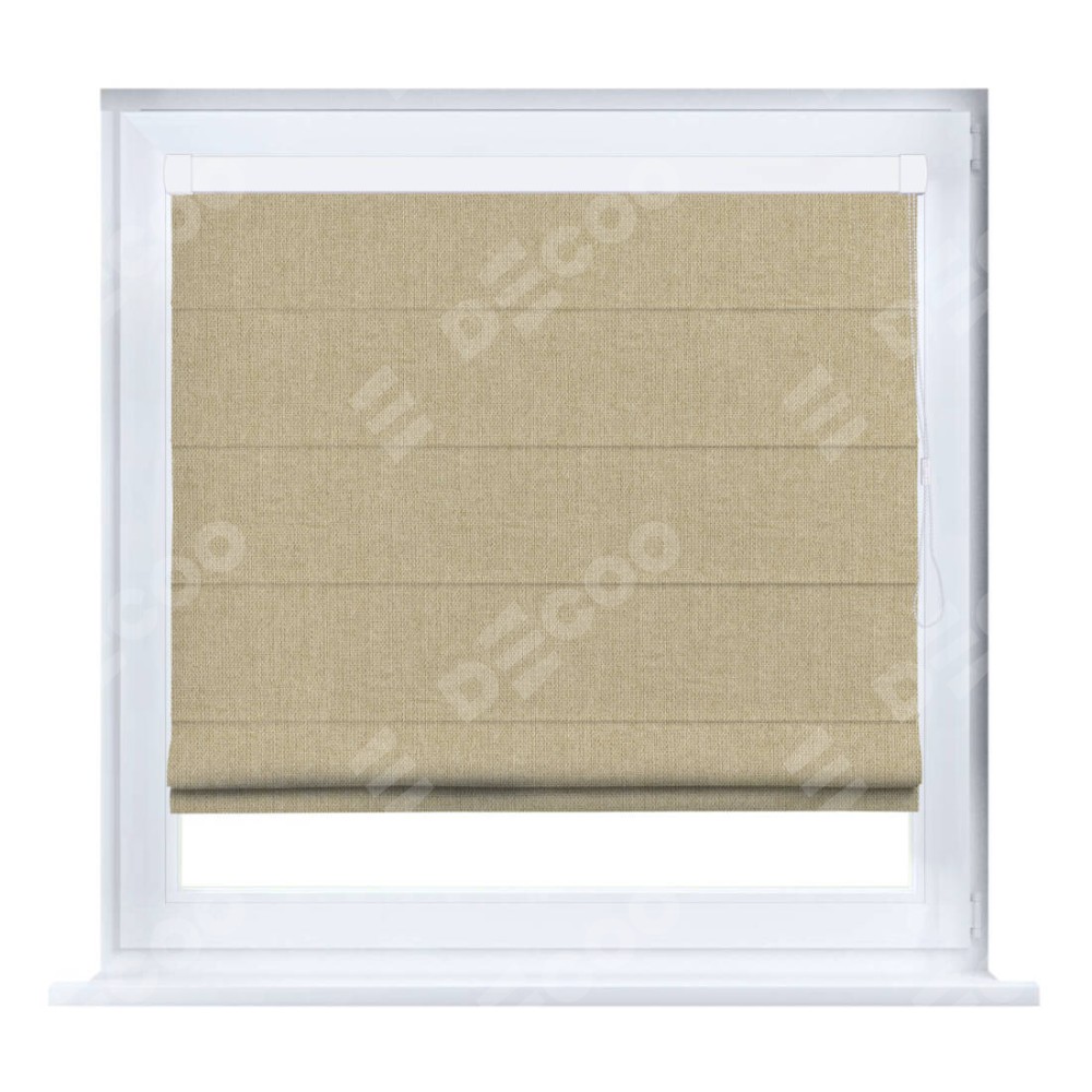 Римская штора производителя «Cortin», устанавливается на створку окна, пошита из ткани лён димаут песочный, артикул 16256. Штора шьётся по индивидуальным размерам, для данного типа римской шторы возможная ширина от 35 до 150 см., высота до 250 см.