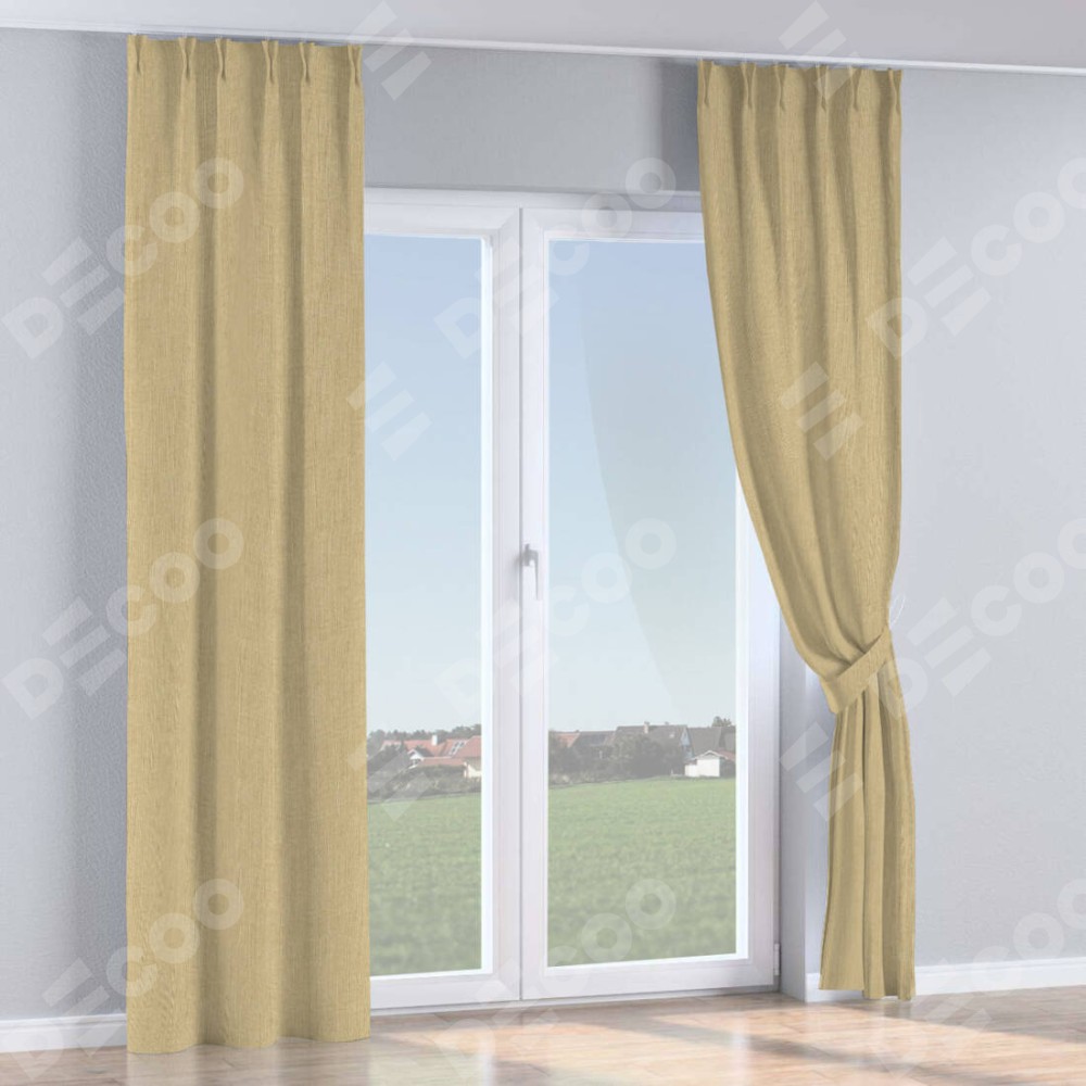 Комплект прямых штор, от производителя «Cortin», пошиты из ткани лён димаут песочный, артикул ткани 16256. С изнаночной стороны в верхней части штор пристрачивается шторная лента с декоративными складками «Кустик». Для создания элегантных складок прямые шторы шьются по стандарту с коэффициентом 1:2 (на 100 см. ширины проёма 200 см. ширины ткани).