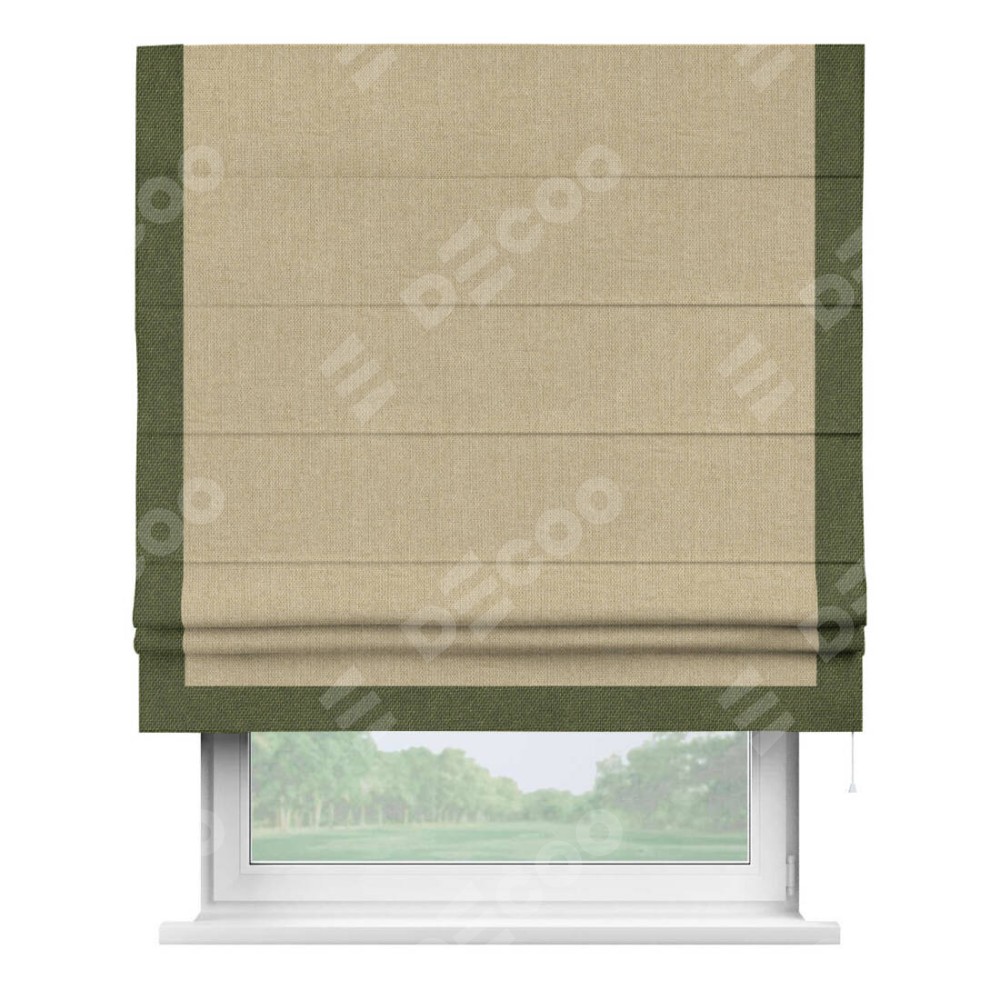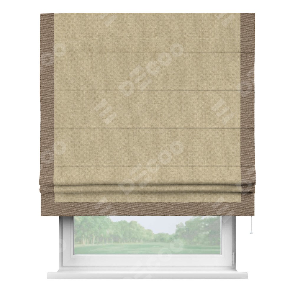 Римская штора с отделкой кантом «Виктория», пошита из ткани лён димаут песочный, артикул: 16256. представляет собой элегантное решение для оконного оформления. Кант по бокам и снизу шторы добавляет изысканности и аккуратности внешнему виду, подчеркивая линии и форму шторы. Этот элемент декора не только украшает, но и выполняет практическую функцию, защищая края ткани от износа. Кант может быть выполнен в контрастном или гармонирующем цвете, что позволяет добиться различных стилевых эффектов и легко вписать штору в интерьер комнаты.
