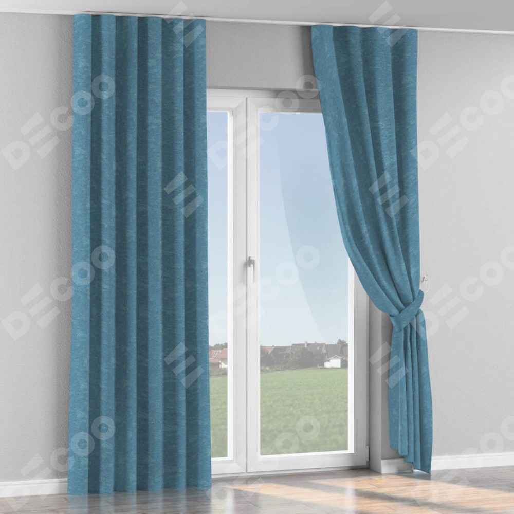 Комплект прямых штор, от производителя «Cortin», пошиты из ткани софт мрамор голубой, артикул ткани 93580. С изнаночной стороны в верхней части штор пристрачивается шторная лента с декоративными складками «Волна». Для создания элегантных складок прямые шторы шьются по стандарту с коэффициентом 1:2 (на 100 см. ширины проёма 200 см. ширины ткани).