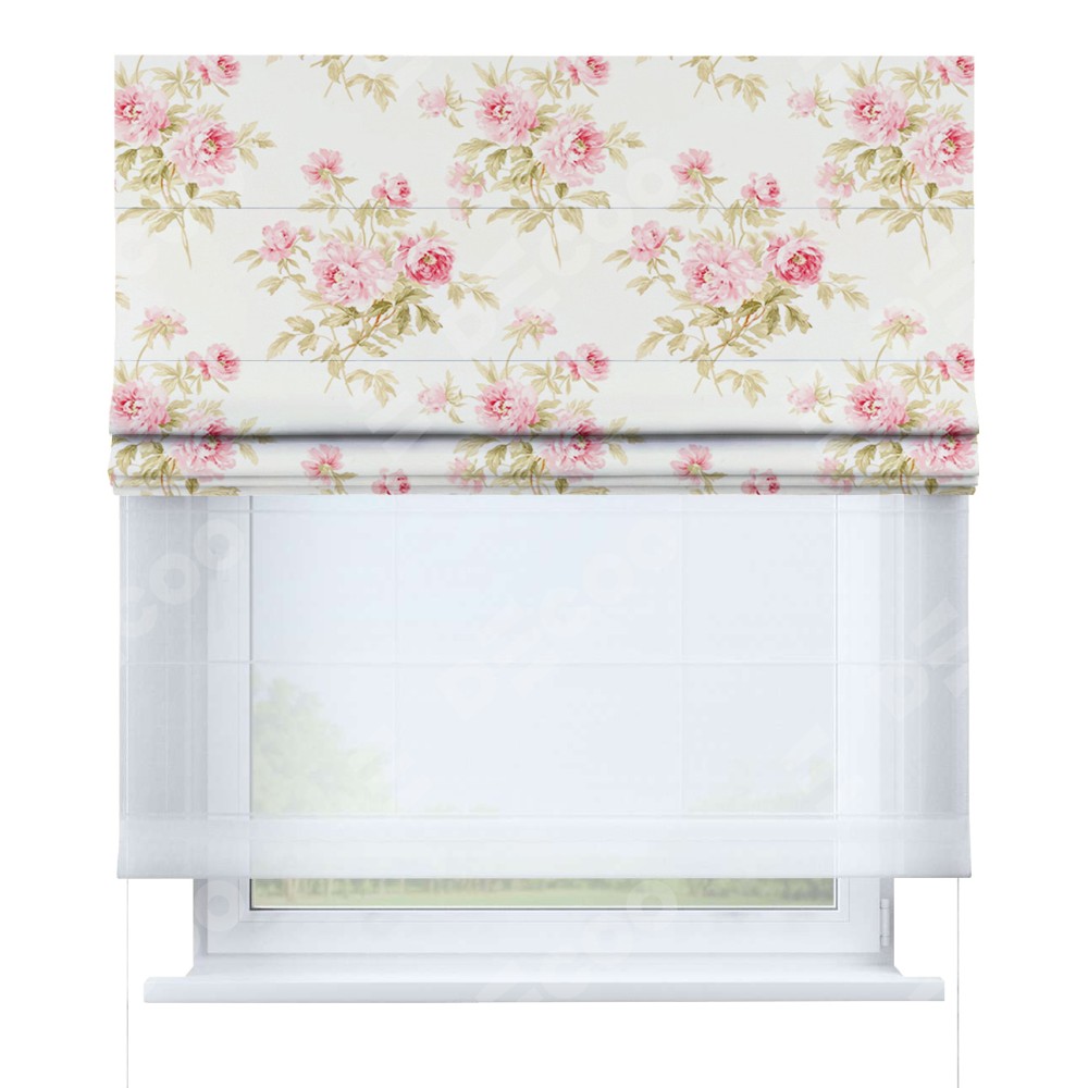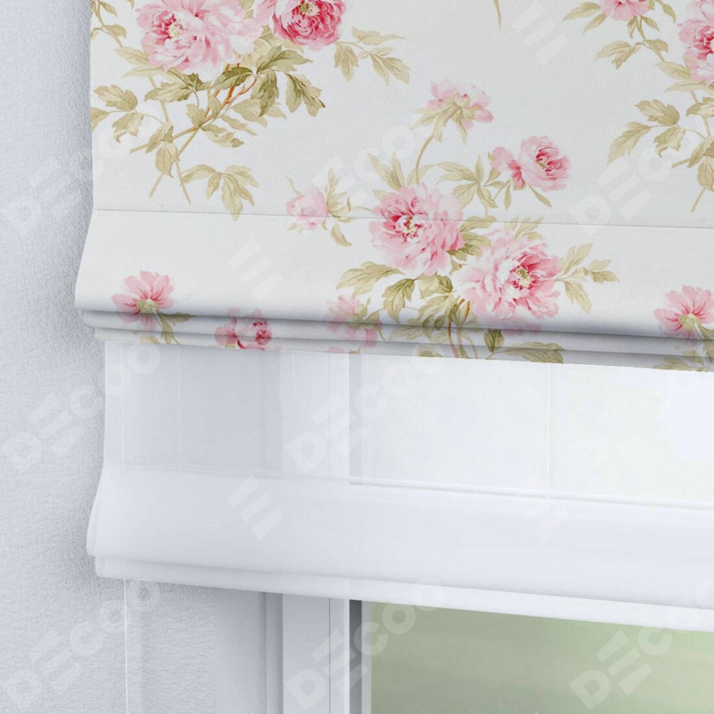 Двойная римская штора «День-ночь» от производителя Cortin предназначена для использования в проёмах. Эта штора уникальна тем, что состоит из двух полотен. На лицевой стороне находится блэкаут с нанесением сублимационной печати «Английский шебби-шик», обеспечивающий эффективное затемнение. В комплект также входит вторая ткань — легкий белый тюль (артикул: V-01), который добавляет изящества и легкости оформлению окна. Кроме того, доступны и другие разновидности ткани тюль, выбор которых доступен по ссылке .
