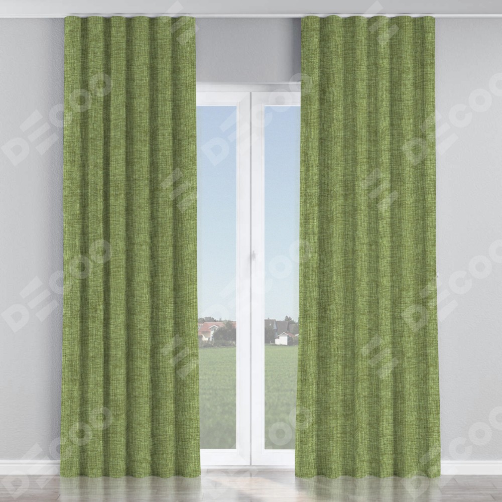 Комплект прямых штор, от производителя «Cortin», пошиты из ткани рогожка димаут травяной, артикул ткани 91021. С изнаночной стороны в верхней части штор пристрачивается шторная лента с декоративными складками «Волна». Для создания элегантных складок прямые шторы шьются по стандарту с коэффициентом 1:2 (на 100 см. ширины проёма 200 см. ширины ткани).