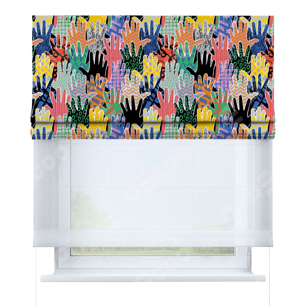 Двойная римская штора «День-ночь» от производителя Cortin предназначена для использования в проёмах. Эта штора уникальна тем, что состоит из двух полотен. На лицевой стороне находится блэкаут с нанесением сублимационной печати «Коллаж поп-арт», обеспечивающий эффективное затемнение. В комплект также входит вторая ткань — легкий белый тюль (артикул: V-01), который добавляет изящества и легкости оформлению окна. Кроме того, доступны и другие разновидности ткани тюль, выбор которых доступен по ссылке .