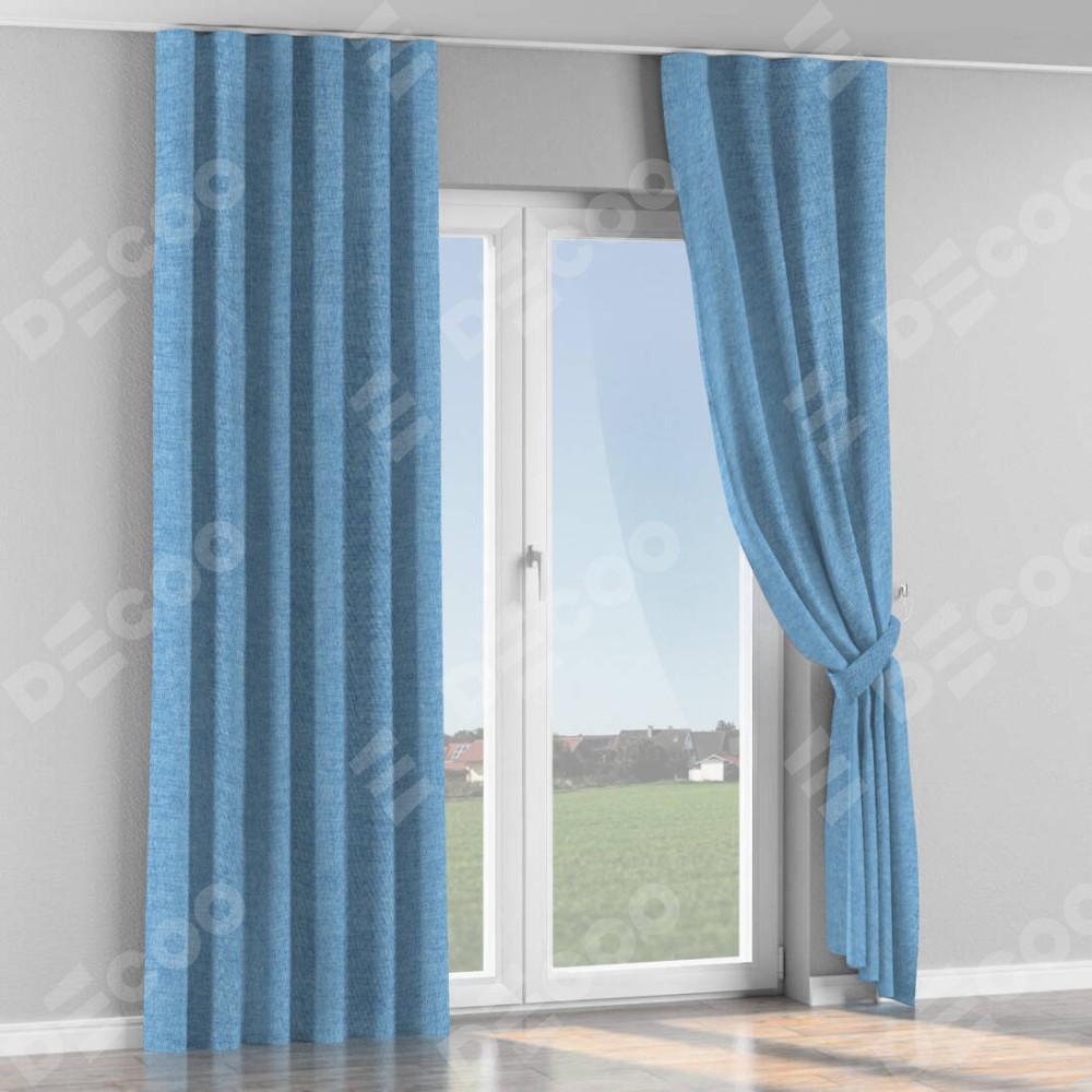 Комплект прямых штор, от производителя «Cortin», пошиты из ткани рогожка димаут голубой, артикул ткани 91025. С изнаночной стороны в верхней части штор пристрачивается шторная лента с декоративными складками «Волна». Для создания элегантных складок прямые шторы шьются по стандарту с коэффициентом 1:2 (на 100 см. ширины проёма 200 см. ширины ткани).