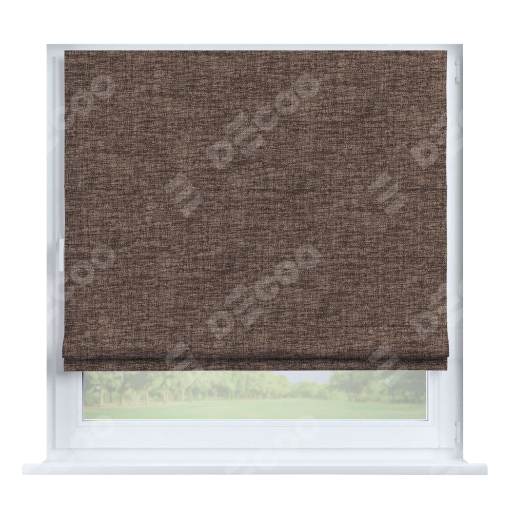 Римская штора производителя «Cortin», устанавливается на створку окна, пошита из ткани рогожка димаут коричневый, артикул 91018. Штора шьётся по индивидуальным размерам, для данного типа римской шторы возможная ширина от 35 до 150 см., высота до 250 см.