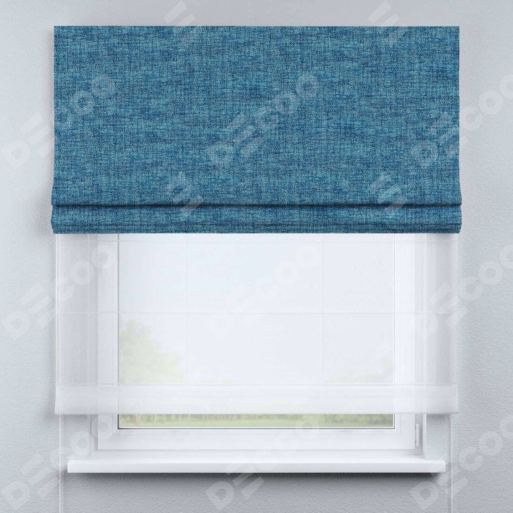 Двойная римская штора «День-ночь» от производителя Cortin предназначена для использования в проёмах. Эта штора уникальна тем, что состоит из двух полотен. На лицевой стороне находится рогожка димаут лазурно-синий (артикул: 91024), обеспечивающий эффективное затемнение. В комплект также входит вторая ткань — легкий белый тюль (артикул: V-01), который добавляет изящества и легкости оформлению окна. Кроме того, доступны и другие разновидности ткани тюль, выбор которых доступен по ссылке .