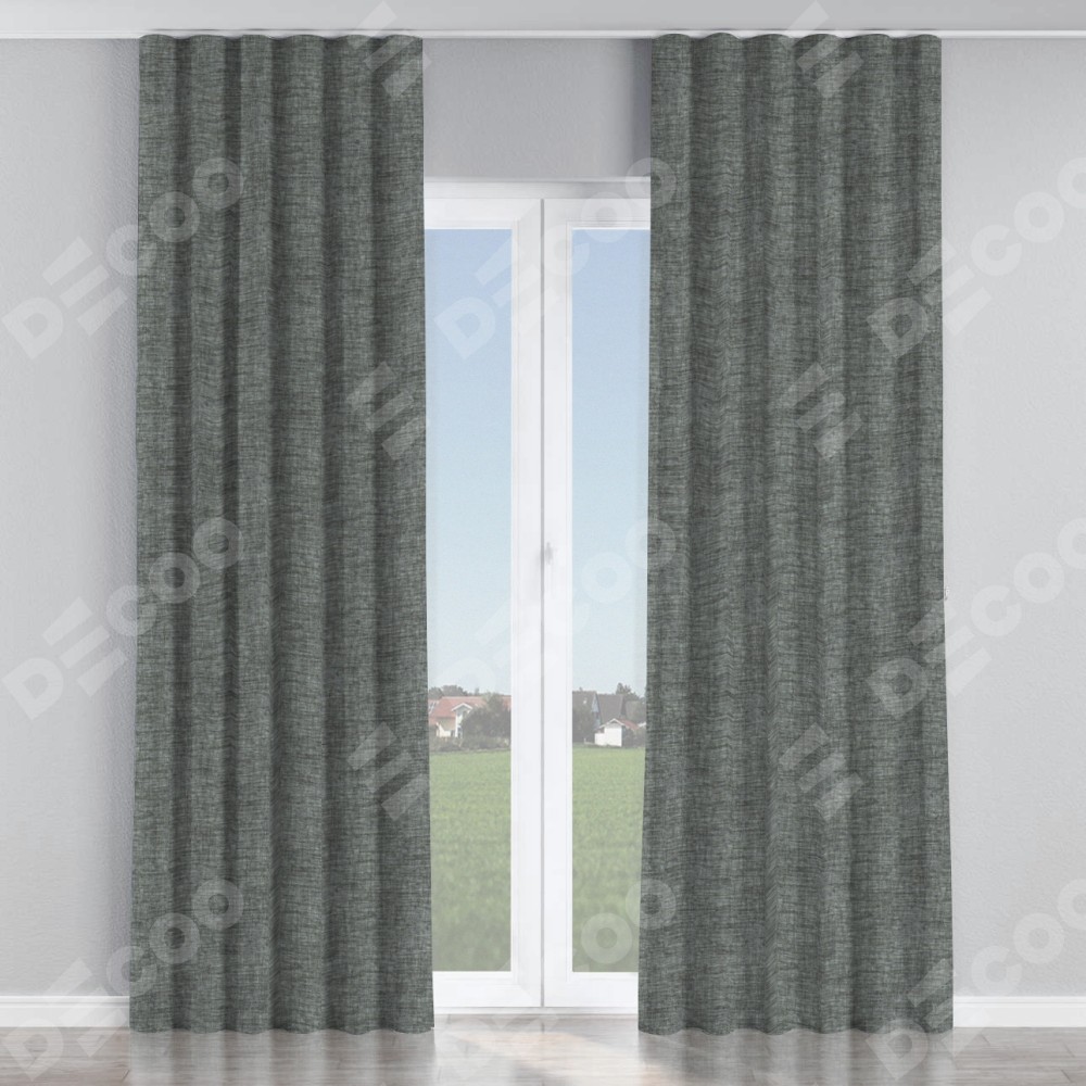 Комплект прямых штор, от производителя «Cortin», пошиты из ткани рогожка димаут тёмно-серый, артикул ткани 91029. С изнаночной стороны в верхней части штор пристрачивается шторная лента с декоративными складками «Волна». Для создания элегантных складок прямые шторы шьются по стандарту с коэффициентом 1:2 (на 100 см. ширины проёма 200 см. ширины ткани).