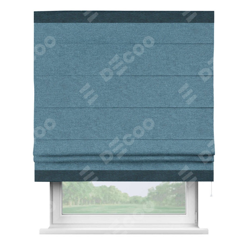 Римская штора пошита из ткани твид блэкаут светло-синий, артикул: 90935, с отделкой кантом «Горизонт» предлагает уникальное дизайнерское решение, при котором кант располагается только вверху и снизу шторы. Такое решение делает акцент на горизонтальных линиях, визуально расширяя пространство и придавая окну более строгий и организованный вид. Отделка кантом в этих ключевых местах не только украшает штору, но и способствует её долговечности, защищая наиболее уязвимые к износу края.
