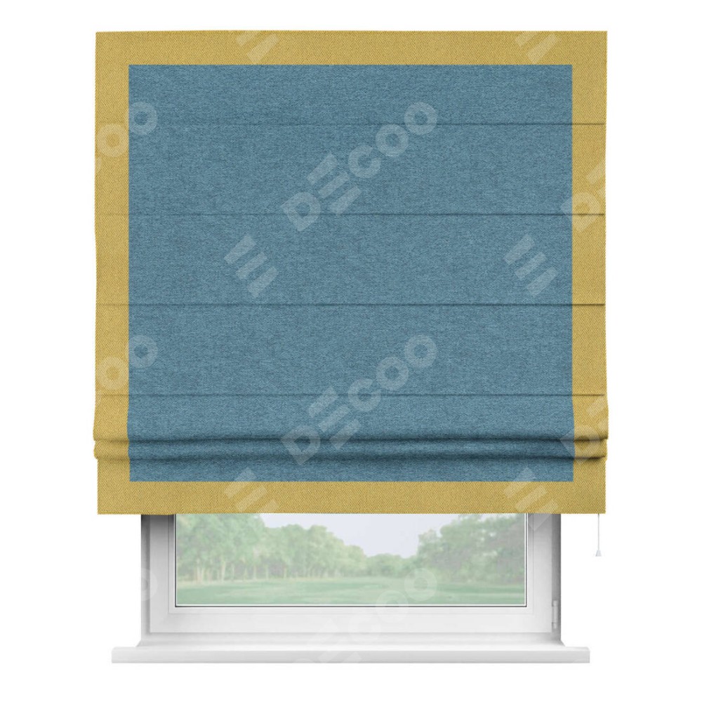 Римская штора пошита из ткани твид блэкаут светло-синий, артикул: 90935, с отделкой кантом «Чесс» отличается своей уникальной деталью — наличием канта не только по бокам и снизу, но и сверху по всем краям шторы. Это придает шторе особенно аккуратный и завершенный вид, делая акцент на границах и форме шторы. Отделка кантом по всему периметру шторы усиливает её декоративные качества и подчеркивает строгую геометрию, что может быть особенно актуально для современных и минималистичных интерьеров.