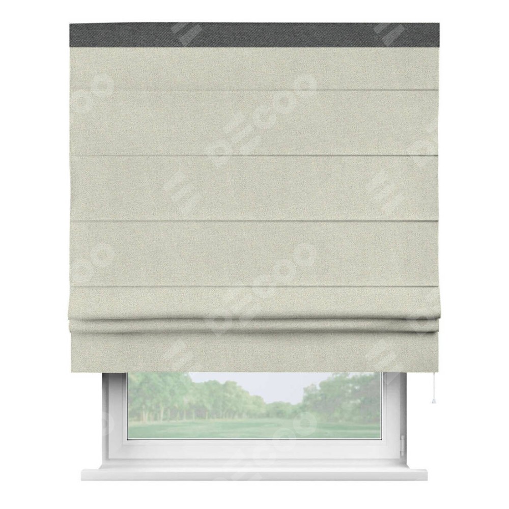 Римская штора пошита из ткани твид блэкаут шампань, артикул: 90929, с отделкой кантом «Кинг» отличается своей необычной особенностью: кант располагается исключительно сверху шторы. Такой дизайн делает акцент на верхней части окна, визуально поднимая потолок и придавая интерьеру более возвышенный и изысканный вид. Отделка кантом на верхней кромке не только украшает штору, но и может служить дополнительной защитой от износа в месте наибольшего контакта с механизмом управления шторой.