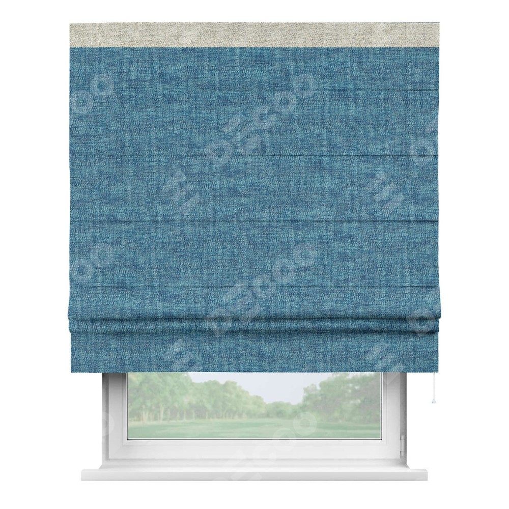 Римская штора пошита из ткани рогожка димаут лазурно-синий, артикул: 91024, с отделкой кантом «Кинг» отличается своей необычной особенностью: кант располагается исключительно сверху шторы. Такой дизайн делает акцент на верхней части окна, визуально поднимая потолок и придавая интерьеру более возвышенный и изысканный вид. Отделка кантом на верхней кромке не только украшает штору, но и может служить дополнительной защитой от износа в месте наибольшего контакта с механизмом управления шторой.