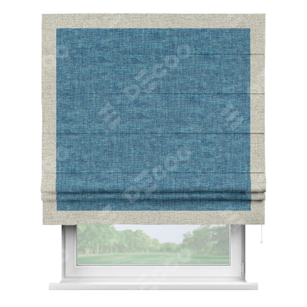 Римская штора пошита из ткани рогожка димаут лазурно-синий, артикул: 91024, с отделкой кантом «Чесс» отличается своей уникальной деталью — наличием канта не только по бокам и снизу, но и сверху по всем краям шторы. Это придает шторе особенно аккуратный и завершенный вид, делая акцент на границах и форме шторы. Отделка кантом по всему периметру шторы усиливает её декоративные качества и подчеркивает строгую геометрию, что может быть особенно актуально для современных и минималистичных интерьеров.