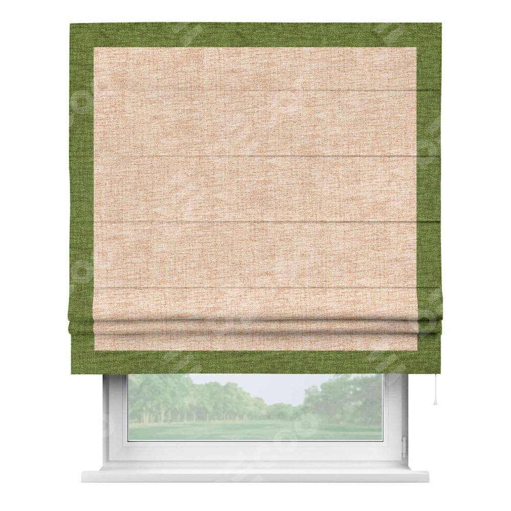 Римская штора пошита из ткани рогожка димаут персиковый, артикул: 91016, с отделкой кантом «Чесс» отличается своей уникальной деталью — наличием канта не только по бокам и снизу, но и сверху по всем краям шторы. Это придает шторе особенно аккуратный и завершенный вид, делая акцент на границах и форме шторы. Отделка кантом по всему периметру шторы усиливает её декоративные качества и подчеркивает строгую геометрию, что может быть особенно актуально для современных и минималистичных интерьеров.