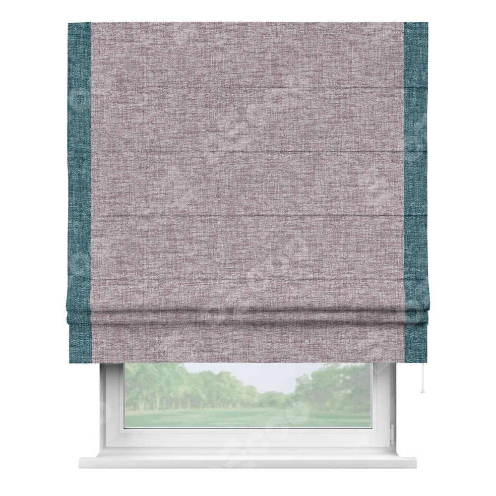 Римская штора пошита из ткани рогожка димаут розовый кварц, артикул: 91030, с отделкой кантом «Стрим Дуо» выделяется наличием кантов по обоим бокам шторы, слева и справа. Этот дизайн придает шторе аккуратный и завершенный вид, акцентируя вертикальные линии и визуально вытягивая окно в высоту. Отделка кантом по бокам не только украшает штору, но и служит практической функцией, укрепляя края и продлевая срок службы изделия.