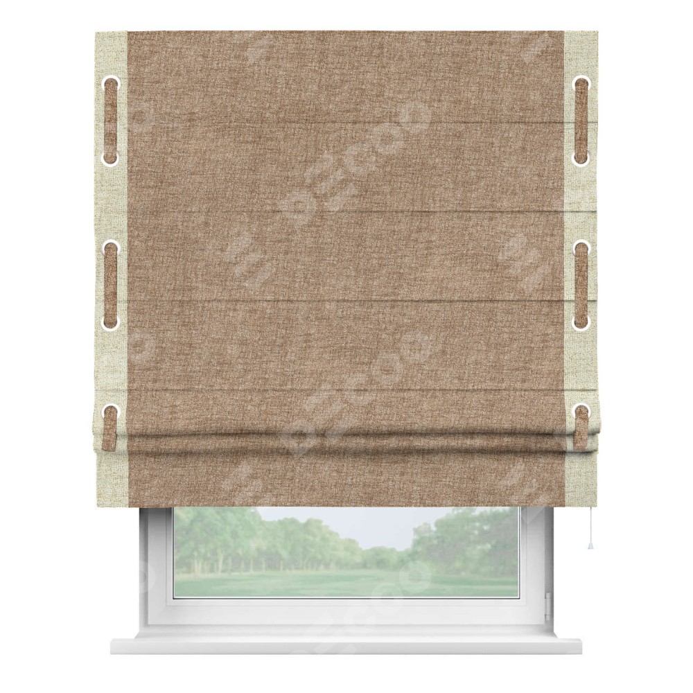 Римская штора пошита из ткани рогожка димаут светло-коричневый, артикул: 91017, с отделкой кантом «Стрим Дуо», дополненная декоративными люверсами на этих кантах и протянутым пояском из основного цвета римской шторы, представляет собой высоко декоративное и функциональное решение для оконного оформления. Канты, расположенные по обеим боковым сторонам шторы, уже добавляют изысканности и завершенности внешнему виду. Добавление люверсов и пояска не только усиливает декоративный эффект, но и придает шторе дополнительную текстурность и глубину.