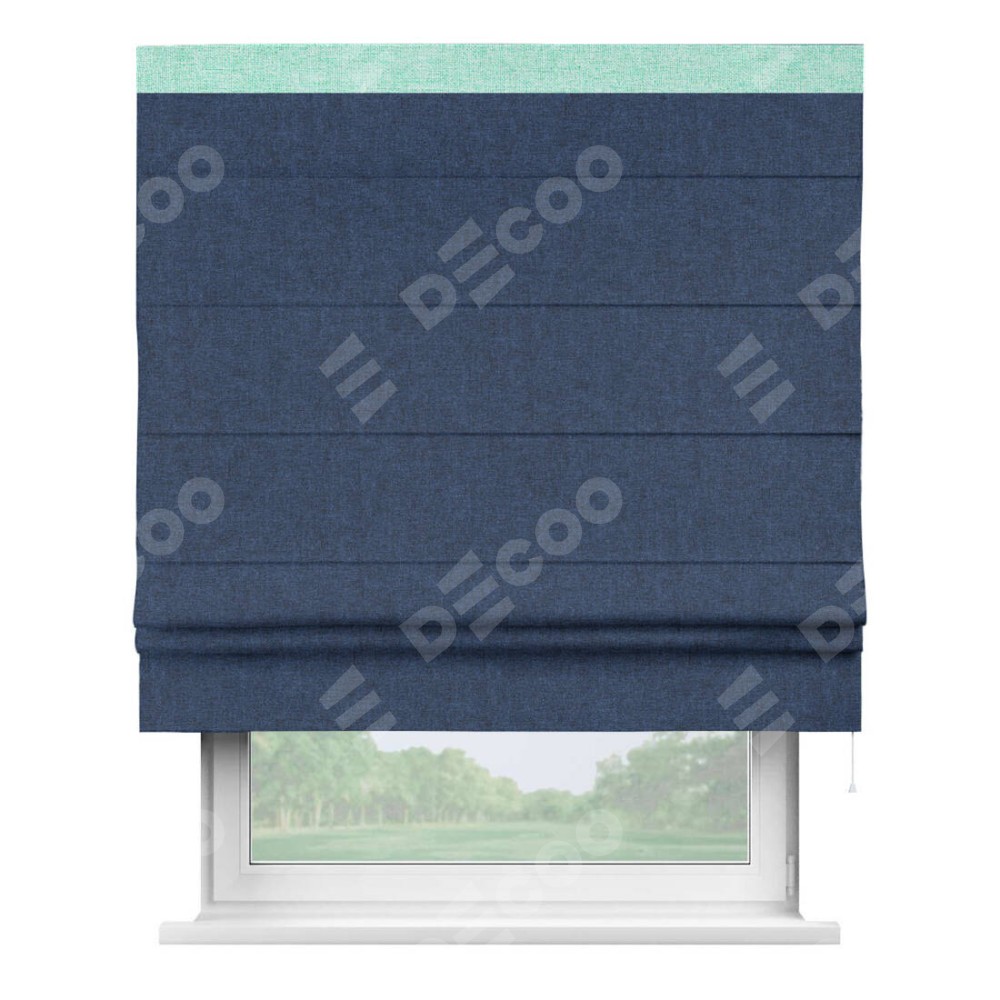 Римская штора пошита из ткани лён кашемир тёмно-синий, артикул: 17215, с отделкой кантом «Кинг» отличается своей необычной особенностью: кант располагается исключительно сверху шторы. Такой дизайн делает акцент на верхней части окна, визуально поднимая потолок и придавая интерьеру более возвышенный и изысканный вид. Отделка кантом на верхней кромке не только украшает штору, но и может служить дополнительной защитой от износа в месте наибольшего контакта с механизмом управления шторой.