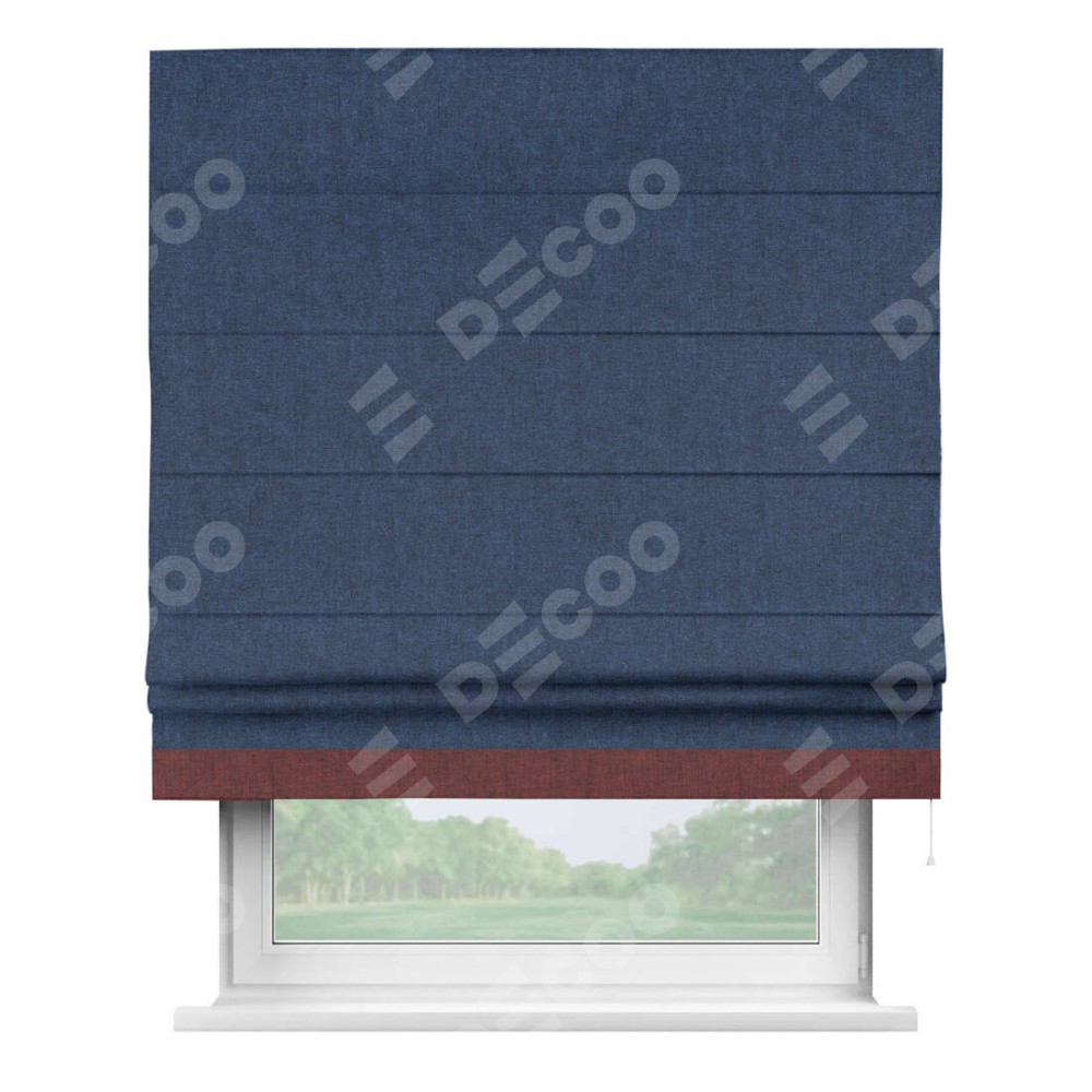 Римская штора пошита из ткани лён кашемир тёмно-синий, артикул: 17215, с отделкой кантом «Джестер» выделяется своей уникальной особенностью — кантом, расположенным только снизу шторы. Этот дизайн добавляет оригинальности и игривости оконному оформлению, делая акцент на нижней части шторы и создавая интересный визуальный эффект. Отделка кантом на нижнем крае не только служит эстетической функции, но и способствует увеличению прочности и износостойкости ткани в этом месте.