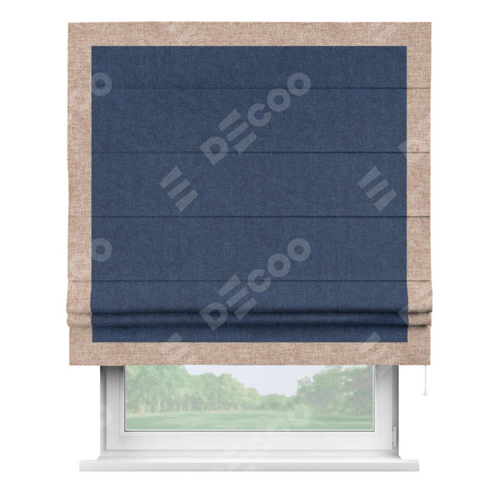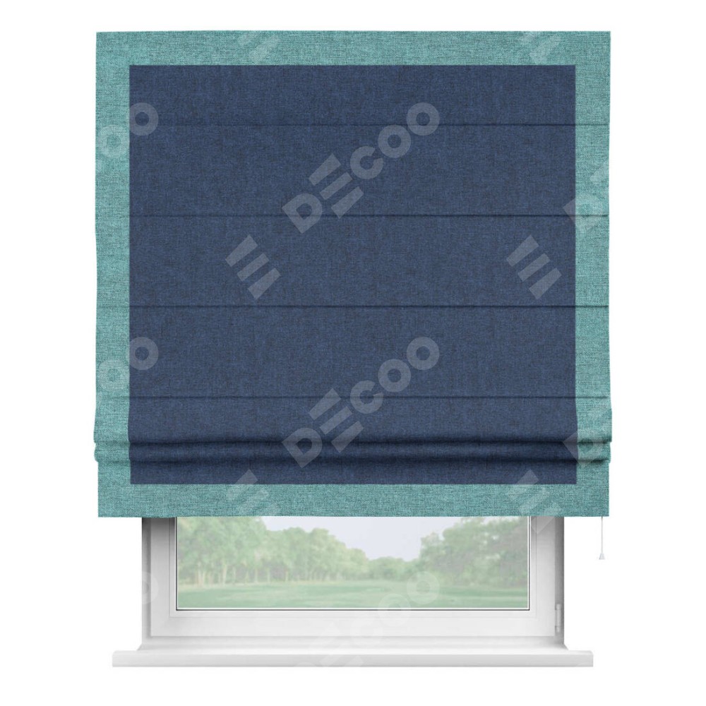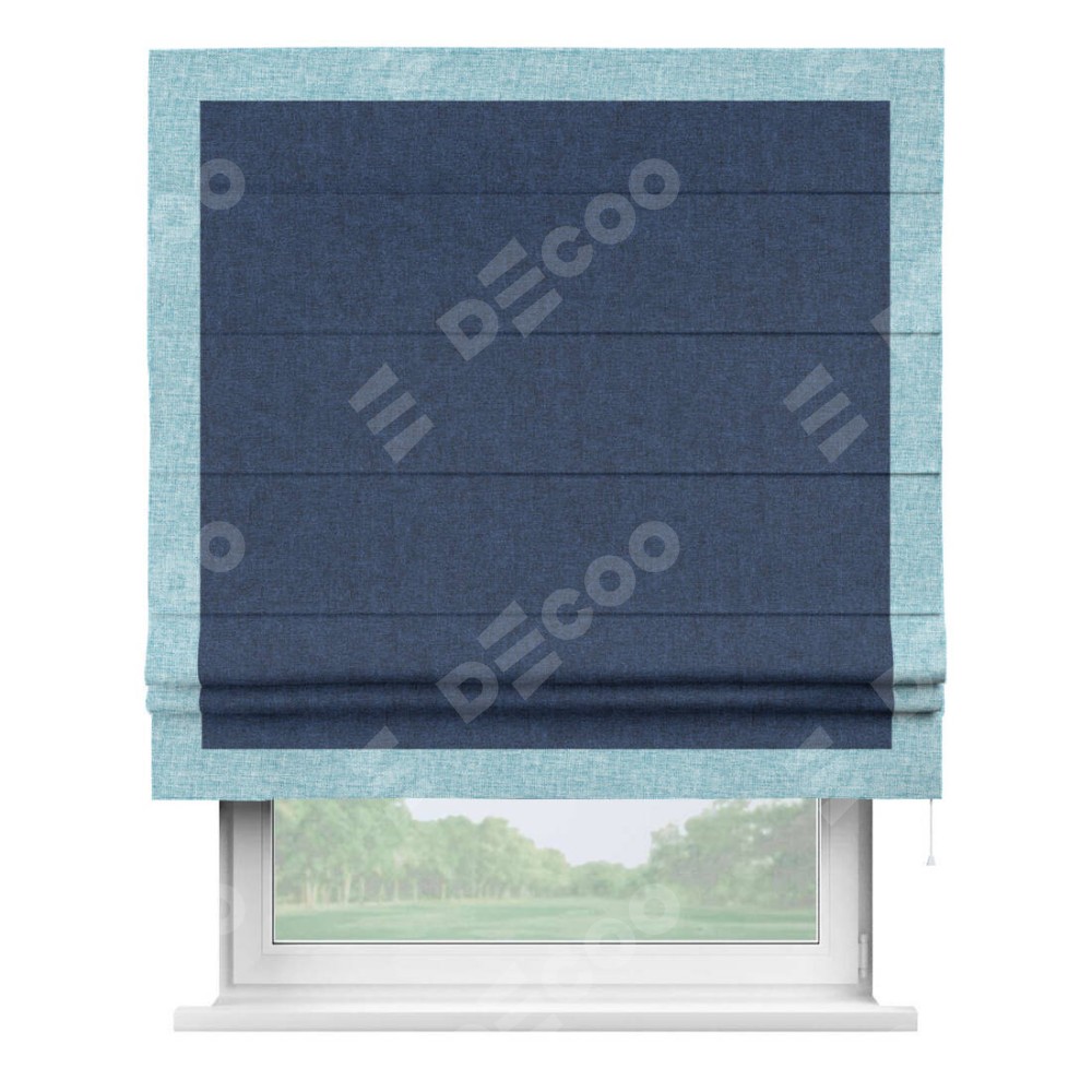 Римская штора пошита из ткани лён кашемир тёмно-синий, артикул: 17215, с отделкой кантом «Чесс» отличается своей уникальной деталью — наличием канта не только по бокам и снизу, но и сверху по всем краям шторы. Это придает шторе особенно аккуратный и завершенный вид, делая акцент на границах и форме шторы. Отделка кантом по всему периметру шторы усиливает её декоративные качества и подчеркивает строгую геометрию, что может быть особенно актуально для современных и минималистичных интерьеров.