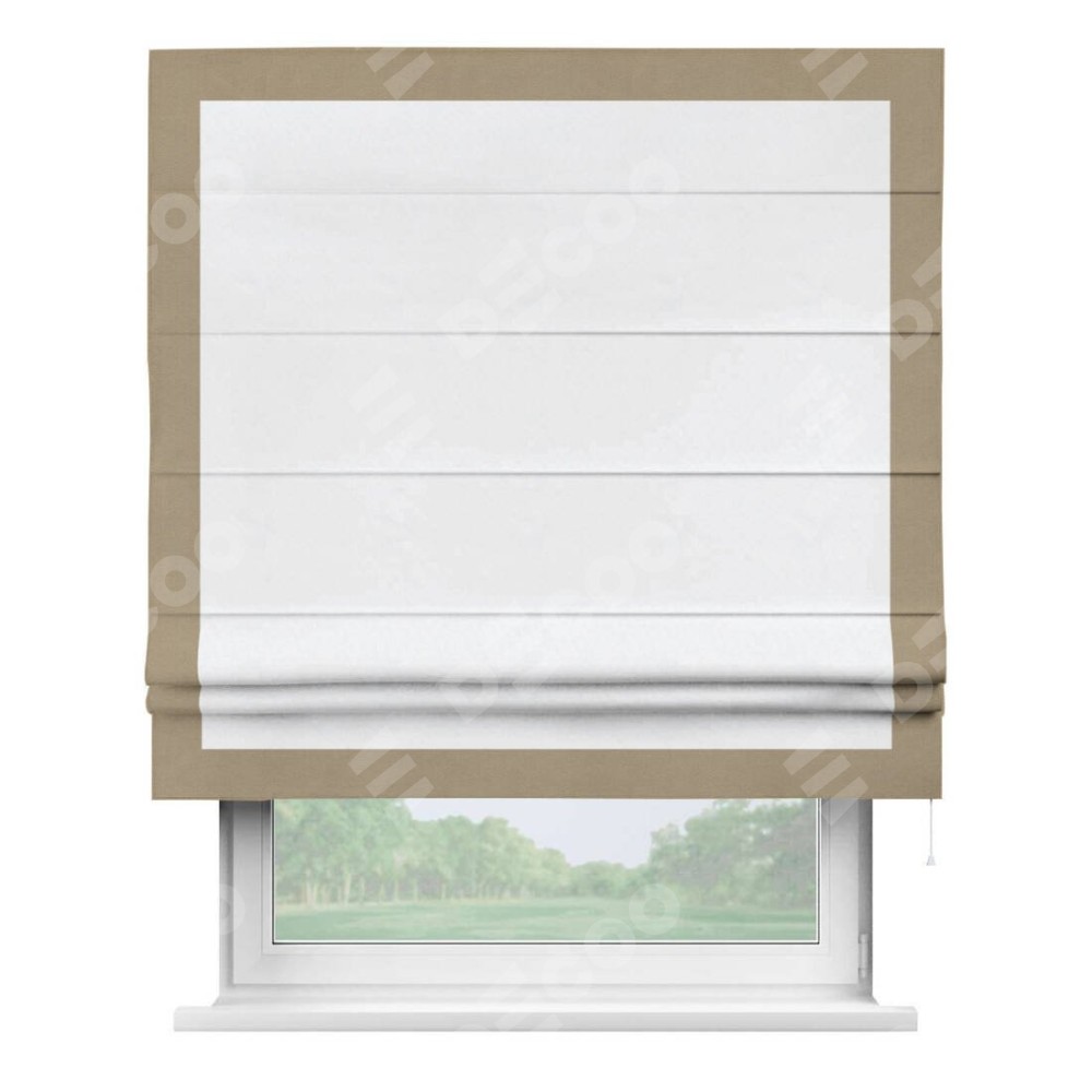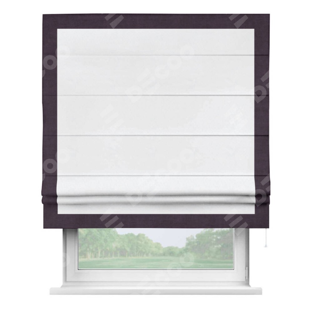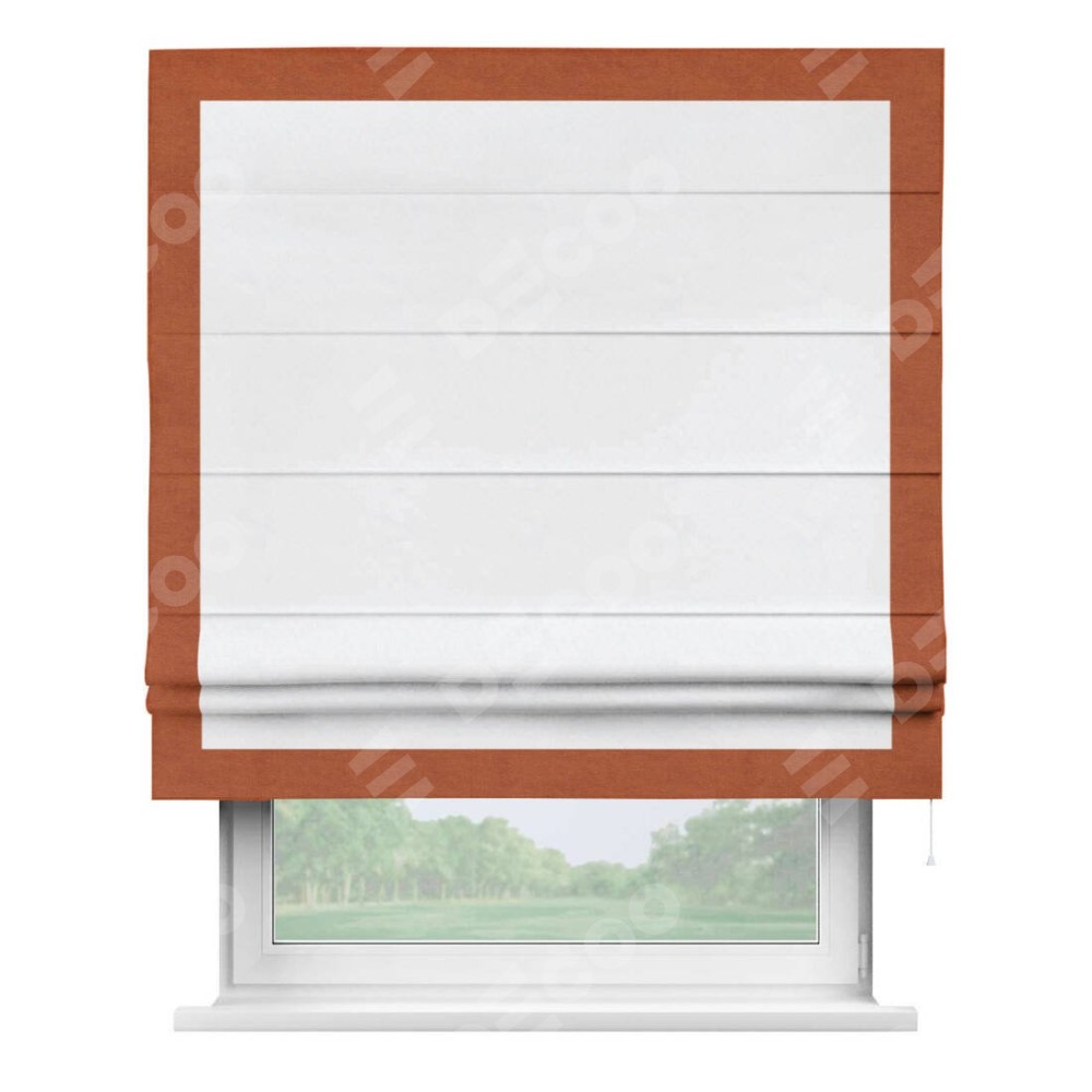 Римская штора пошита из ткани вельвет белоснежный, артикул: 92698, с отделкой кантом «Чесс» отличается своей уникальной деталью — наличием канта не только по бокам и снизу, но и сверху по всем краям шторы. Это придает шторе особенно аккуратный и завершенный вид, делая акцент на границах и форме шторы. Отделка кантом по всему периметру шторы усиливает её декоративные качества и подчеркивает строгую геометрию, что может быть особенно актуально для современных и минималистичных интерьеров.