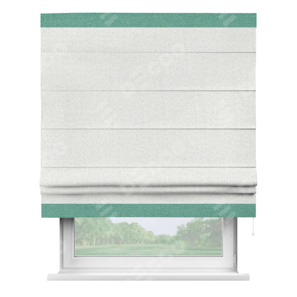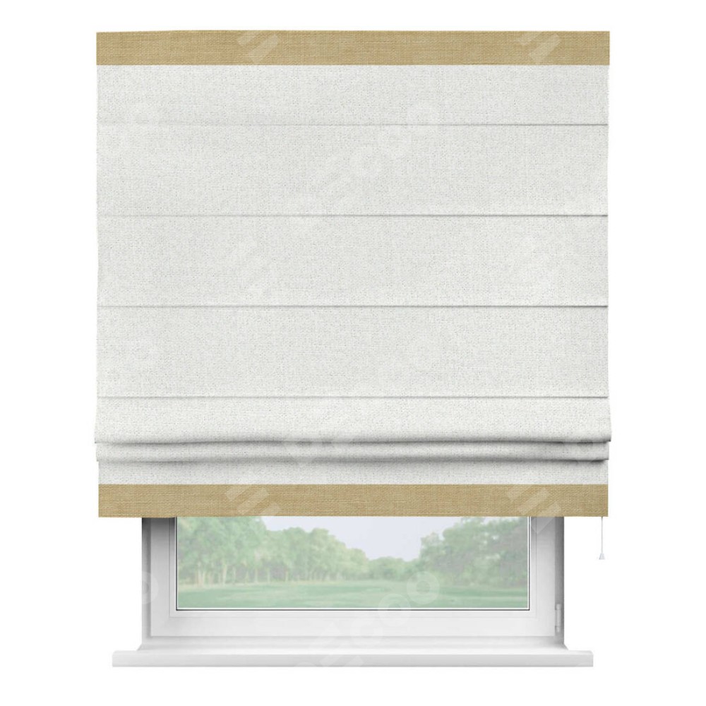 Римская штора пошита из ткани лён шампань, артикул: 91399, с отделкой кантом «Горизонт» предлагает уникальное дизайнерское решение, при котором кант располагается только вверху и снизу шторы. Такое решение делает акцент на горизонтальных линиях, визуально расширяя пространство и придавая окну более строгий и организованный вид. Отделка кантом в этих ключевых местах не только украшает штору, но и способствует её долговечности, защищая наиболее уязвимые к износу края.