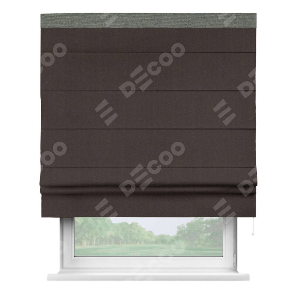 Римская штора пошита из ткани лён димаут венге, артикул: 91001, с отделкой кантом «Кинг» отличается своей необычной особенностью: кант располагается исключительно сверху шторы. Такой дизайн делает акцент на верхней части окна, визуально поднимая потолок и придавая интерьеру более возвышенный и изысканный вид. Отделка кантом на верхней кромке не только украшает штору, но и может служить дополнительной защитой от износа в месте наибольшего контакта с механизмом управления шторой.