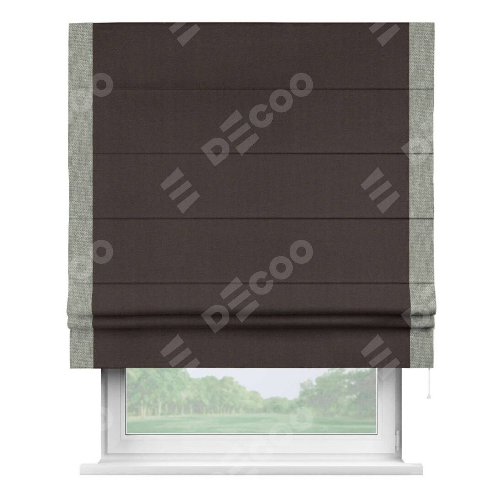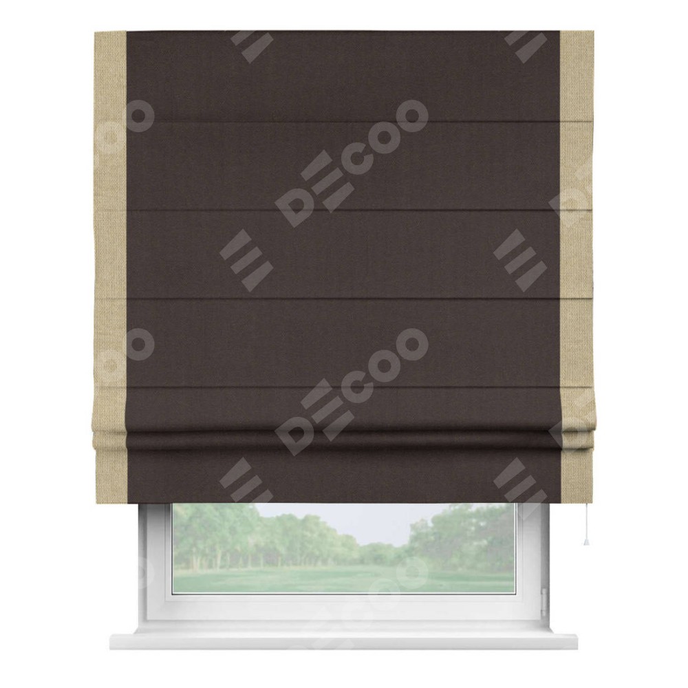 Римская штора пошита из ткани лён димаут венге, артикул: 91001, с отделкой кантом «Стрим Дуо» выделяется наличием кантов по обоим бокам шторы, слева и справа. Этот дизайн придает шторе аккуратный и завершенный вид, акцентируя вертикальные линии и визуально вытягивая окно в высоту. Отделка кантом по бокам не только украшает штору, но и служит практической функцией, укрепляя края и продлевая срок службы изделия.