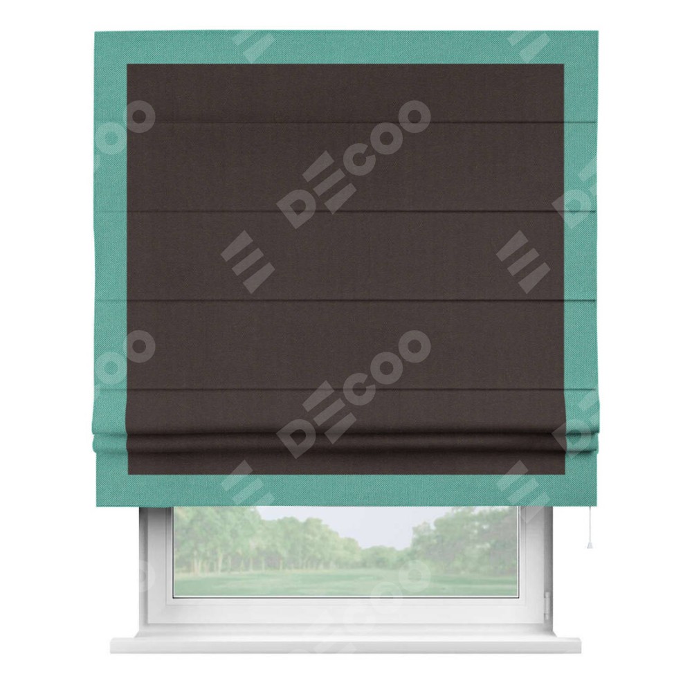 Римская штора пошита из ткани лён димаут венге, артикул: 91001, с отделкой кантом «Чесс» отличается своей уникальной деталью — наличием канта не только по бокам и снизу, но и сверху по всем краям шторы. Это придает шторе особенно аккуратный и завершенный вид, делая акцент на границах и форме шторы. Отделка кантом по всему периметру шторы усиливает её декоративные качества и подчеркивает строгую геометрию, что может быть особенно актуально для современных и минималистичных интерьеров.
