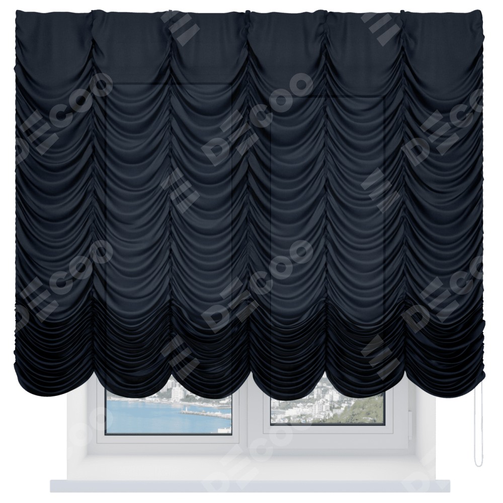 Французская штора производителя «Cortin», используется для проёма, пошита из ткани лён черный, артикул ткани 85927. Имеет универсальный механизм и подходит для монтажа: на потолок и на стену.