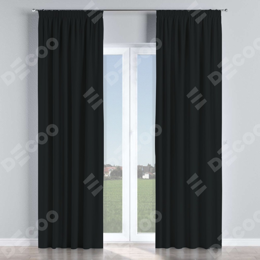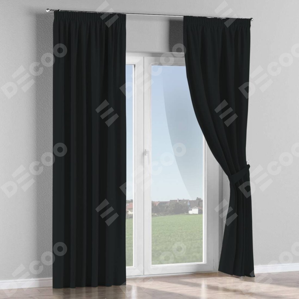 Комплект прямых штор, от производителя «Cortin», пошиты из ткани блэкаут однотонный черный, артикул ткани 37. С изнаночной стороны в верхней части штор пристрачивается шторная лента с декоративными складками «Карандаш». Для создания элегантных складок прямые шторы шьются по стандарту с коэффициентом 1:2 (на 100 см. ширины проёма 200 см. ширины ткани).