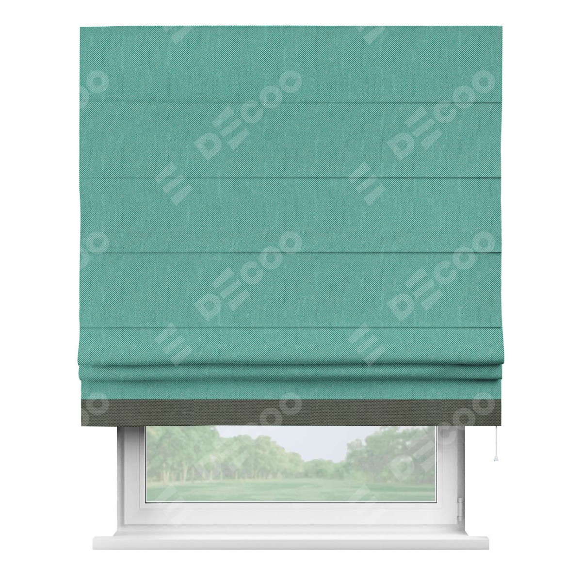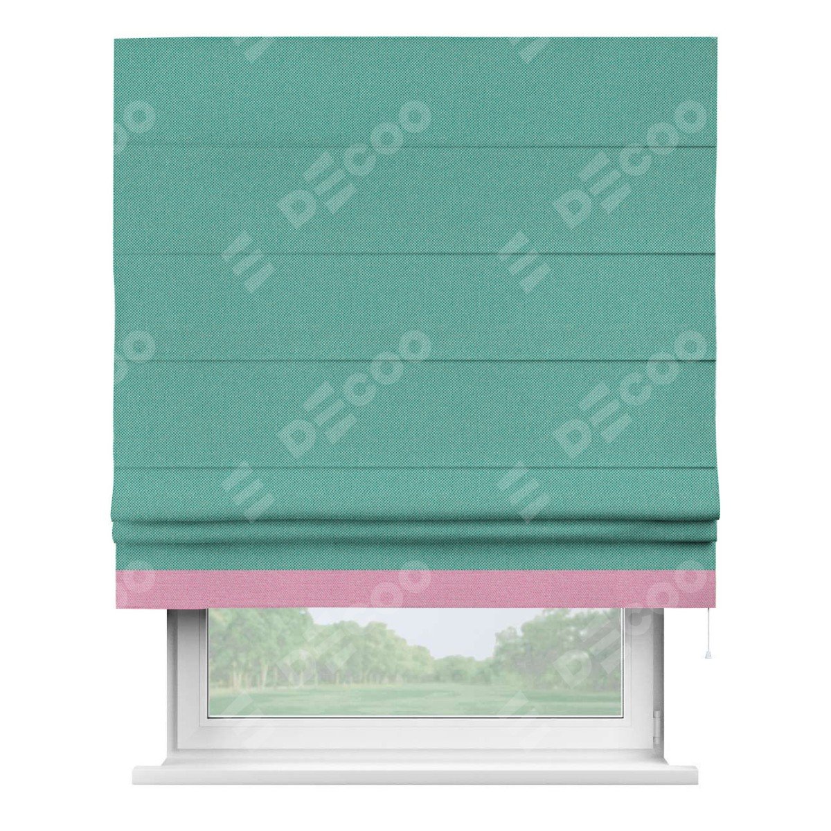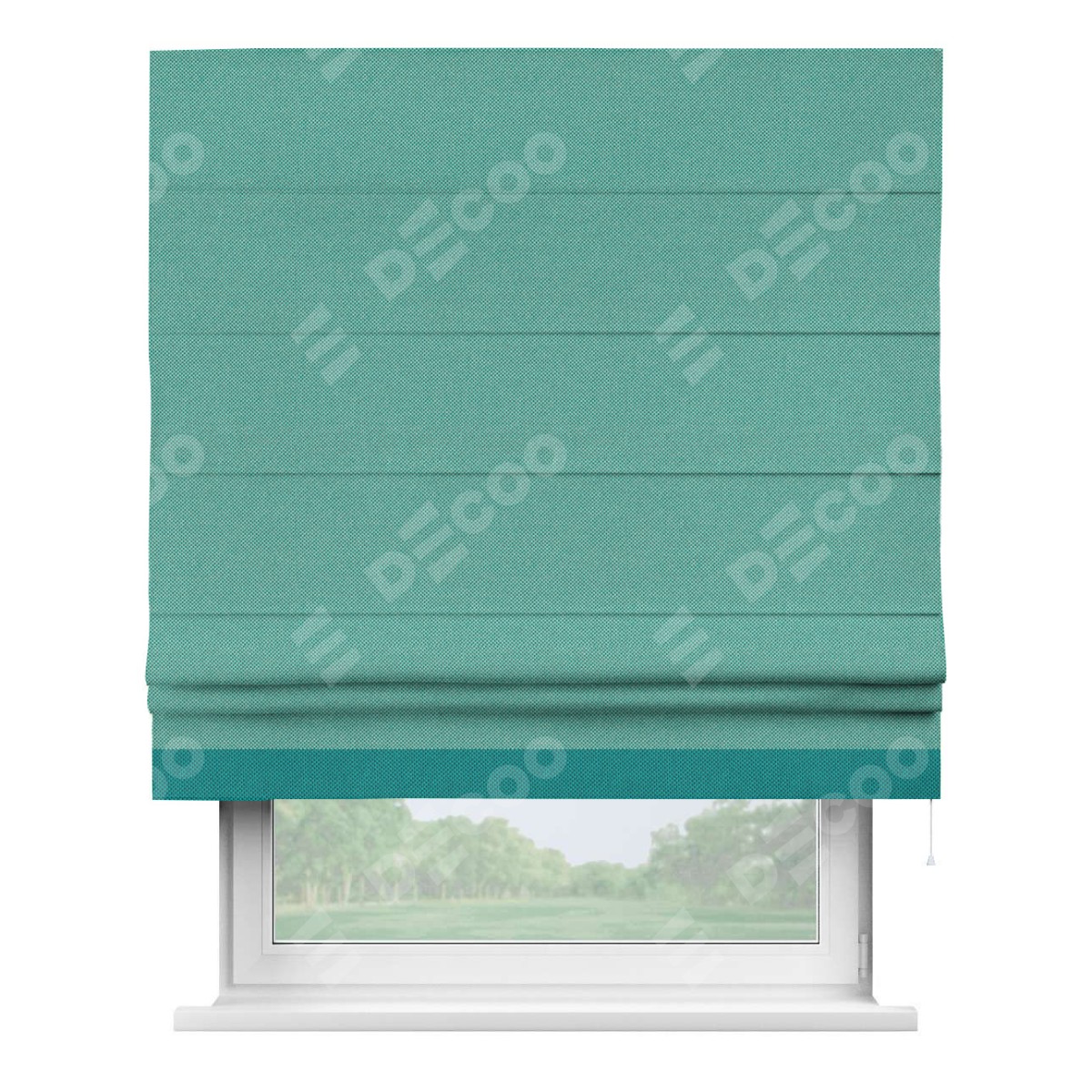 Римская штора производителя «Cortin», используется для проёма, пошита из ткани лён димаут бирюзовый, артикул 23. Отделка шторы кантом «Джестер», ткань для канта используется из льна димаут разной расцветки на выбор. Имеет универсальный механизм и подходит для монтажа: на потолок, на стену и в нишу.