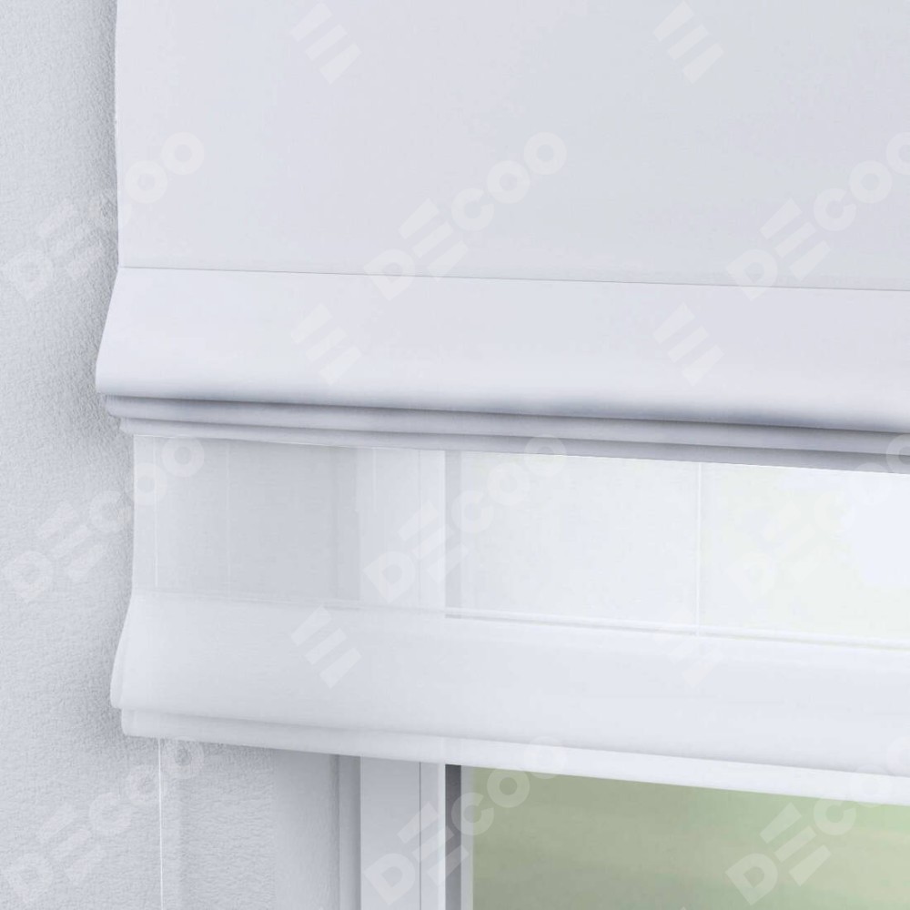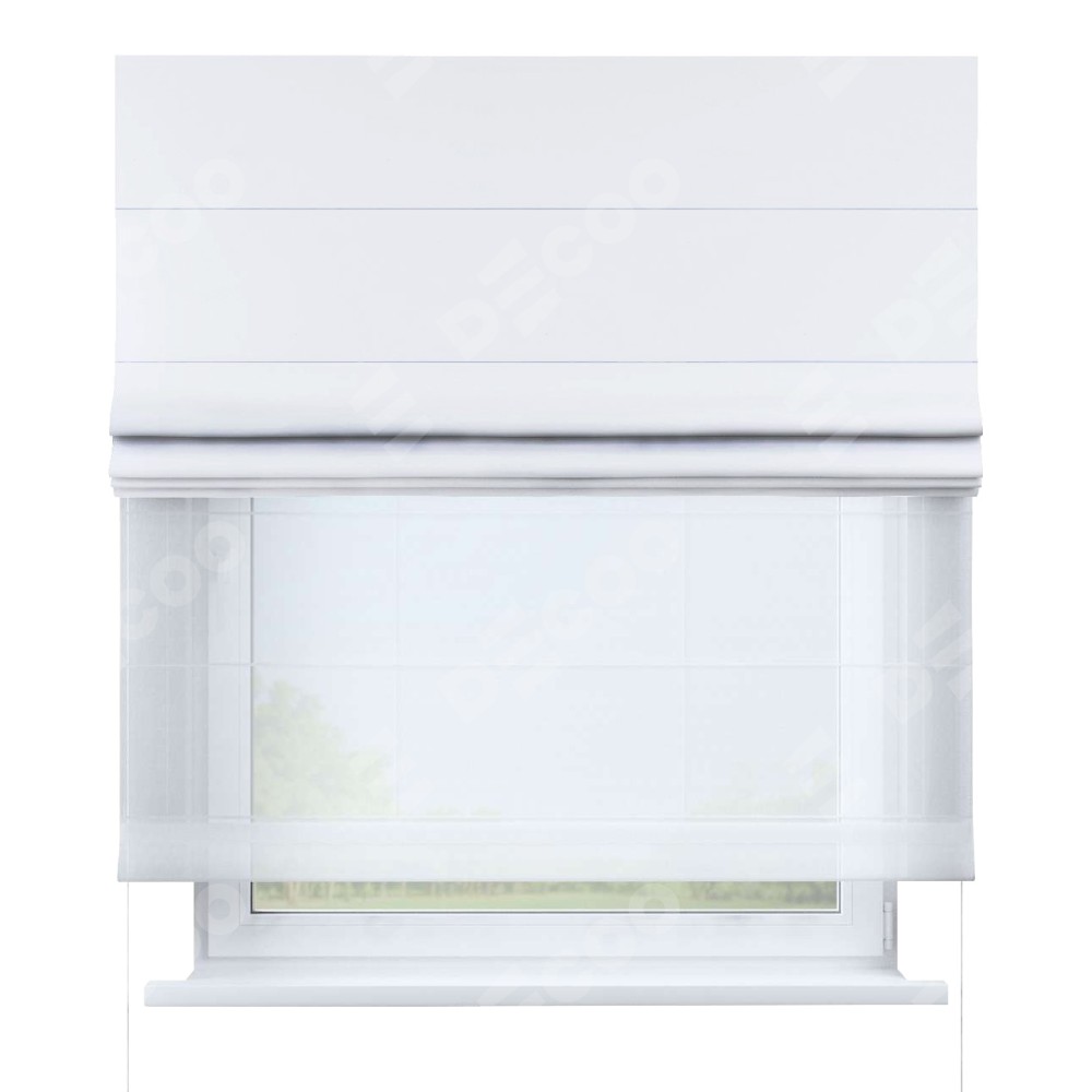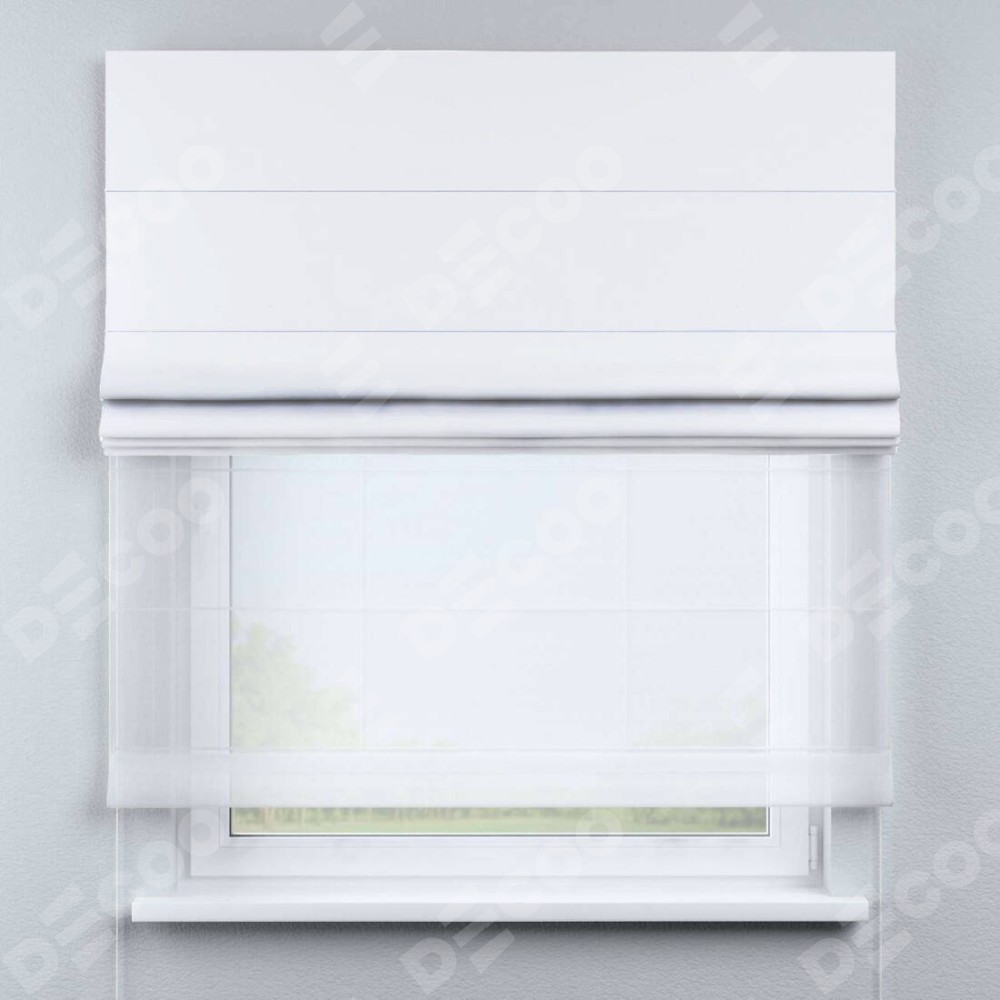 Двойная римская штора «День-ночь» от производителя Cortin предназначена для использования в проёмах. Эта штора уникальна тем, что состоит из двух полотен. На лицевой стороне находится вайтаут однотонная белая (артикул: 93935), обеспечивающий эффективное затемнение. В комплект также входит вторая ткань — легкий белый тюль (артикул: V-01), который добавляет изящества и легкости оформлению окна. Кроме того, доступны и другие разновидности ткани тюль, выбор которых доступен по ссылке .