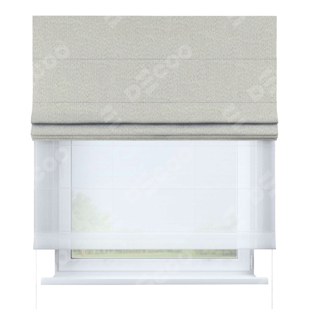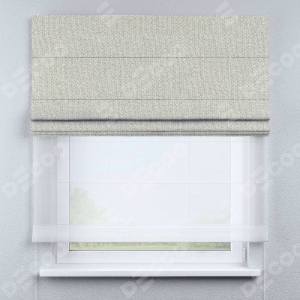 Двойная римская штора «День-ночь» от производителя Cortin предназначена для использования в проёмах. Эта штора уникальна тем, что состоит из двух полотен. На лицевой стороне находится лён димаут светло-бежевый (артикул: 140649), обеспечивающий эффективное затемнение. В комплект также входит вторая ткань — легкий белый тюль (артикул: V-01), который добавляет изящества и легкости оформлению окна. Кроме того, доступны и другие разновидности ткани тюль, выбор которых доступен по ссылке .